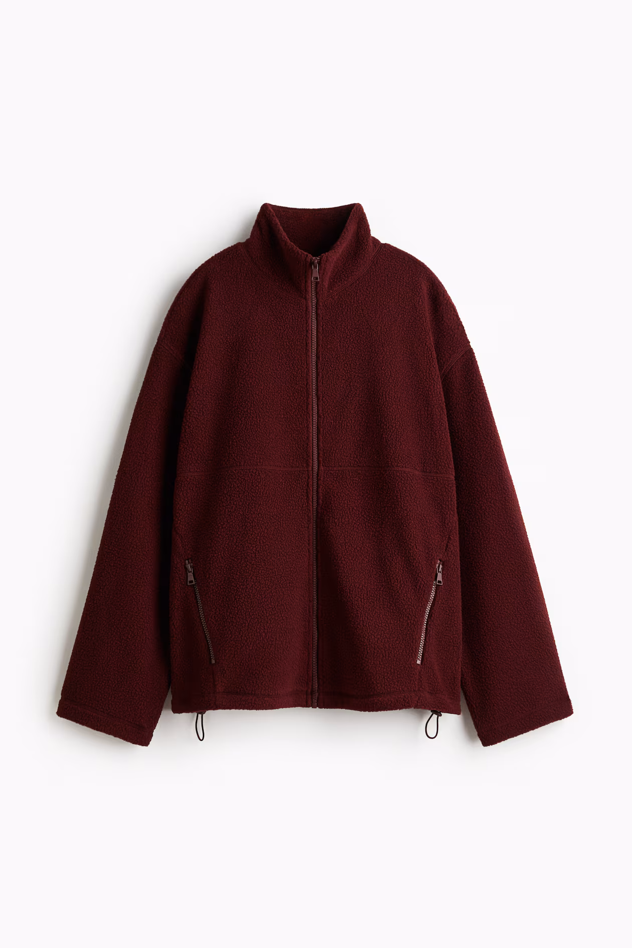 Oversized jacket in soft teddy fleece. Stand-up collar, zipper at front, and side pockets with zipper. Dropped shoulders and long sleeves. Drawstring at hem for adjustable fit. Unlined.