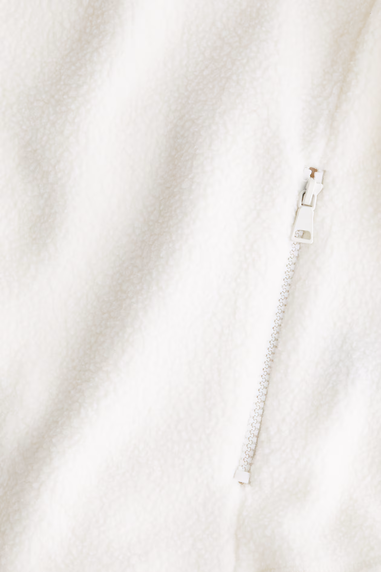 Oversized jacket in soft teddy fleece. Stand-up collar, zipper at front, and side pockets with zipper. Dropped shoulders and long sleeves. Drawstring at hem for adjustable fit. Unlined.