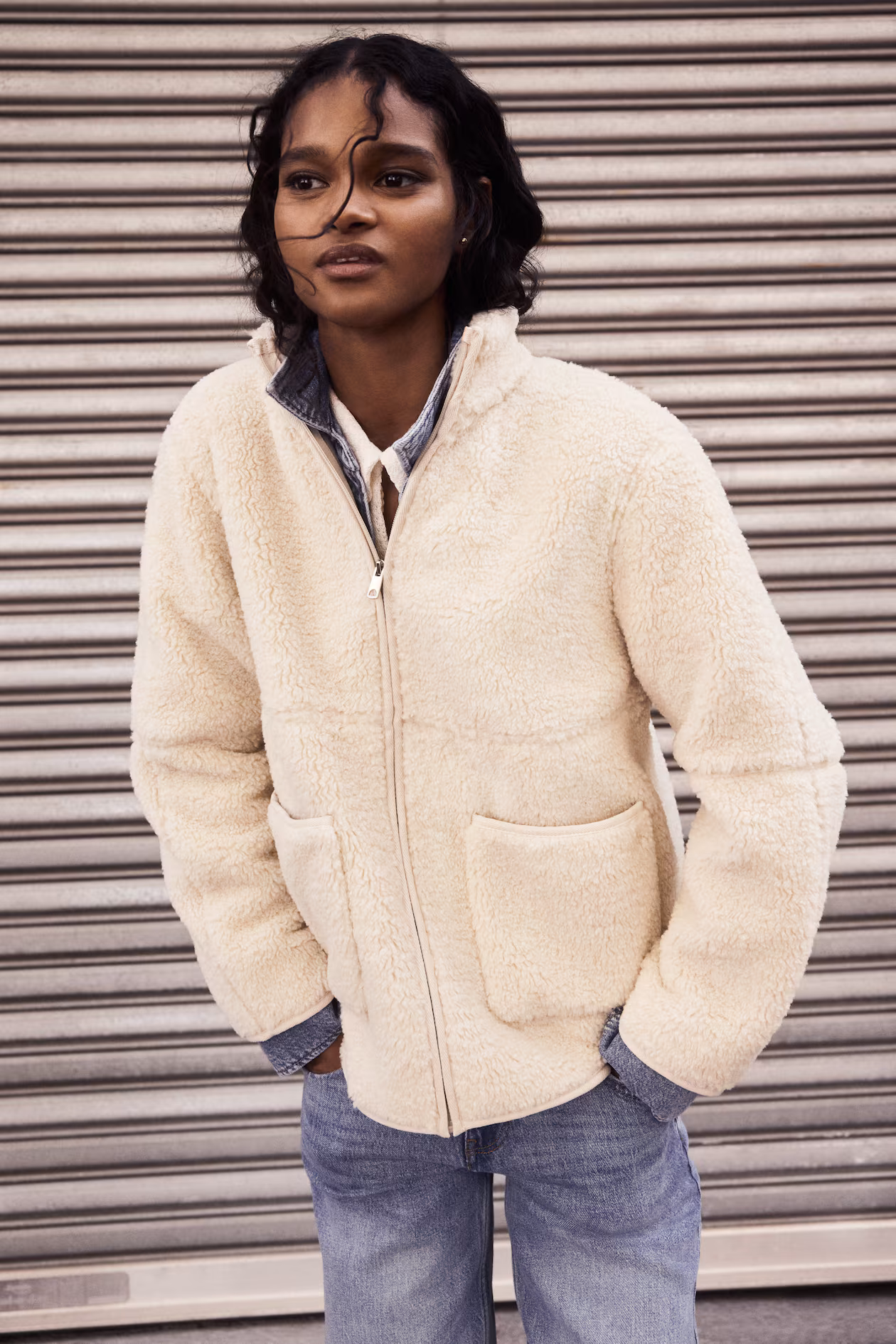 Jacket in soft teddy fleece with woven binding. Chimney collar, concealed zipper at front, and patch front pockets. Dropped shoulders and long sleeves. Straight-cut hem with rounded side vents. Lined.
