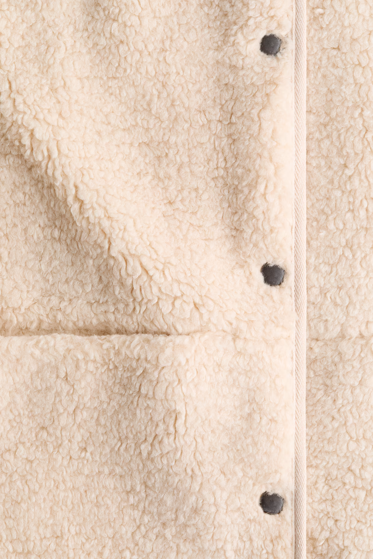 Vest in soft teddy fleece with jersey binding. Snap fasteners at front and discreet front pockets with concealed snap fastener. Lined.
