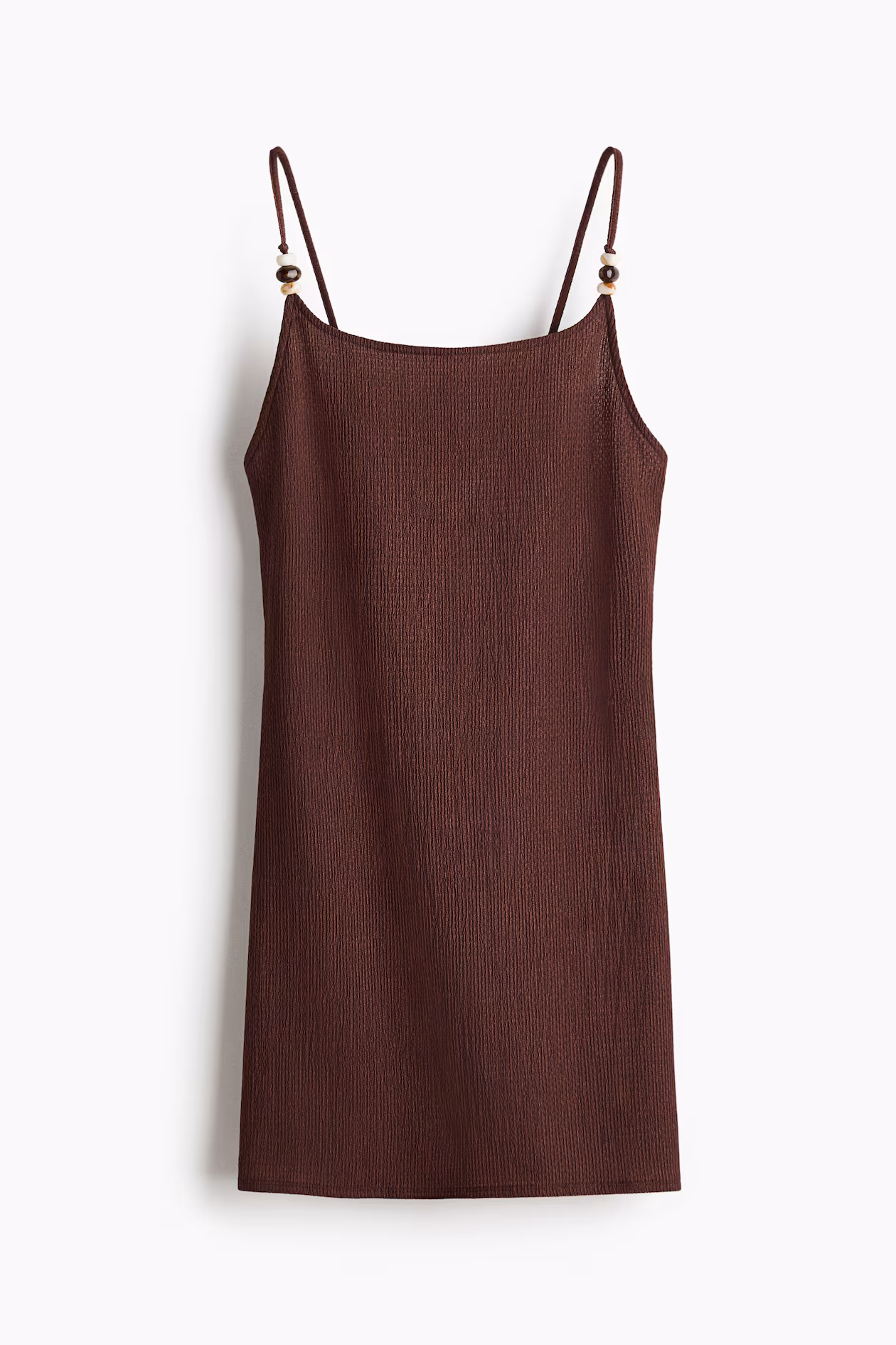 Short, fitted beach dress in textured jersey. Narrow, bead-embellished shoulder straps, square neckline at front, and a scoop back with gathered elastic.