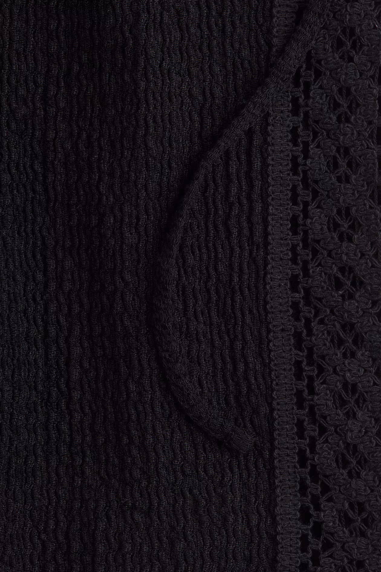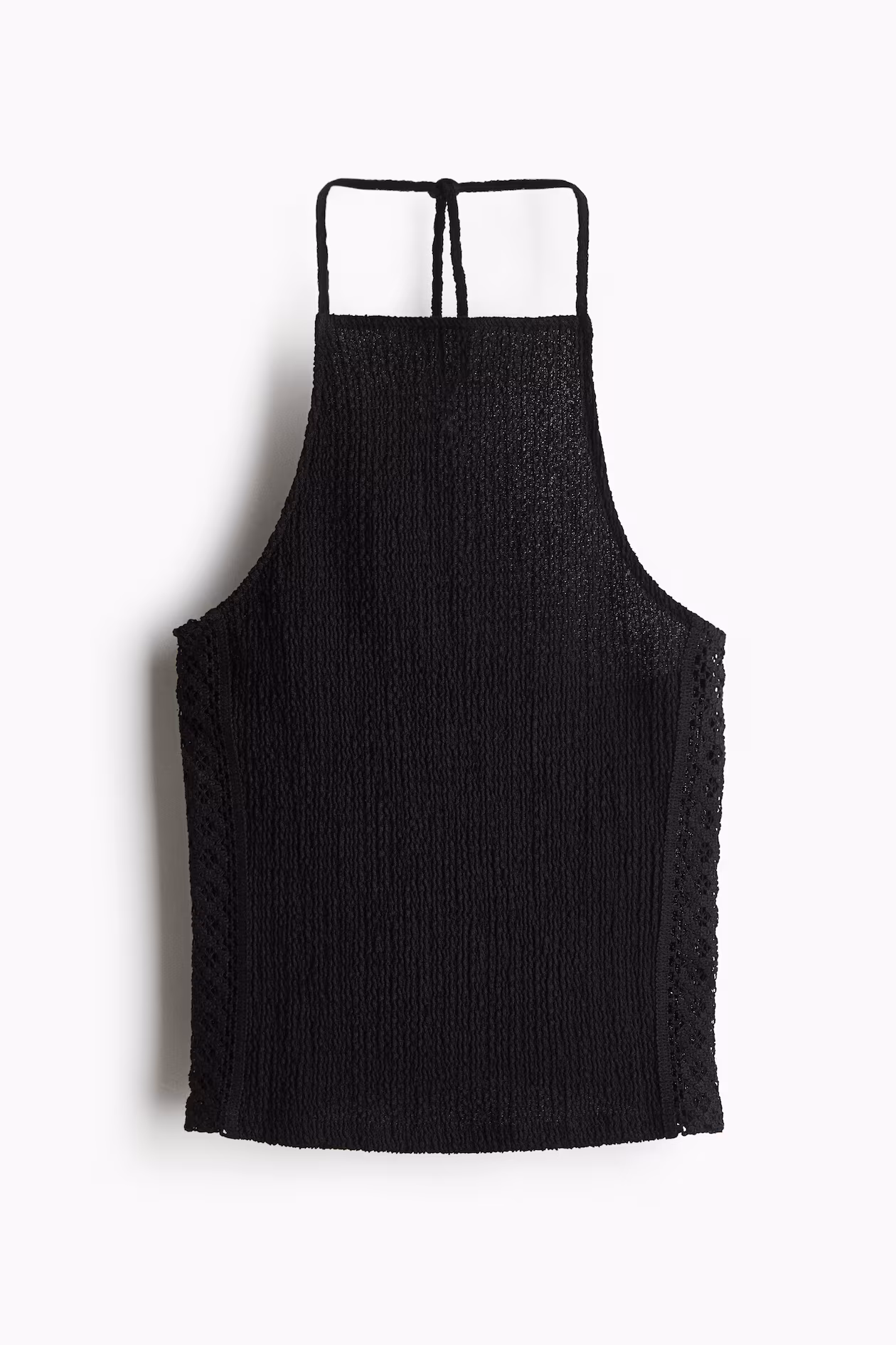 Short, fitted top in textured jersey. Narrow halterneck ties, straight neckline at front, and a low-cut back. Lace-look panels at sides.