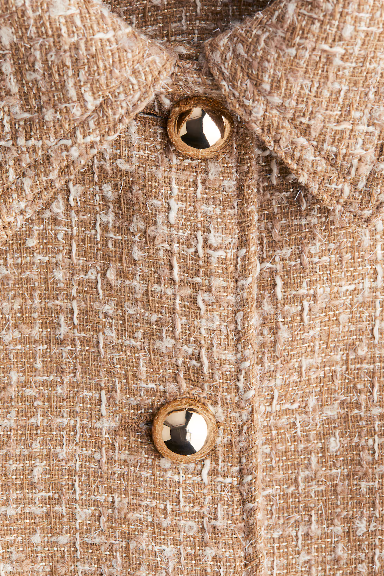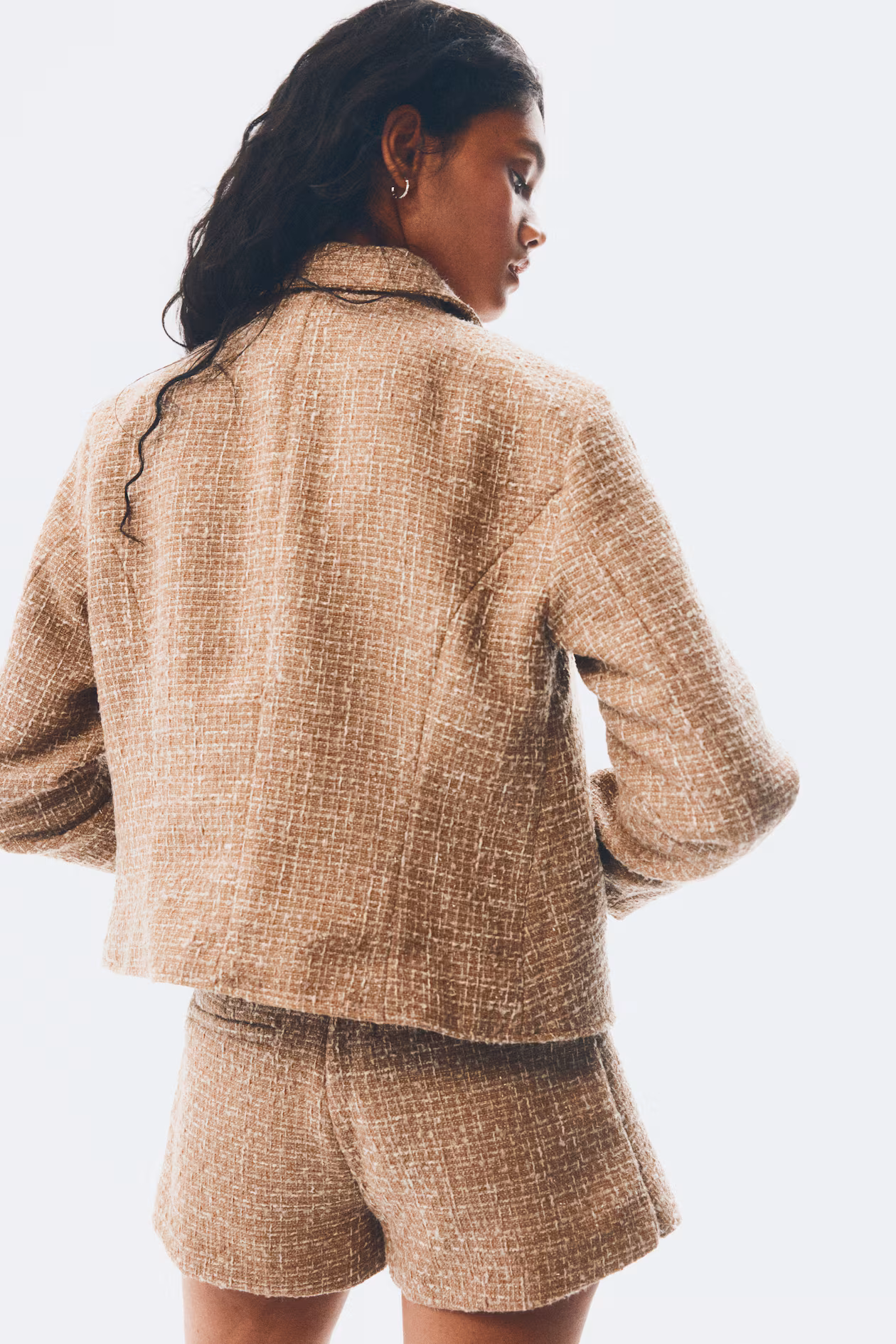 Short, fitted jacket in woven, textured fabric. Collar, domed metal buttons at front, and shaping seams at front and back for a defined silhouette. Lined.