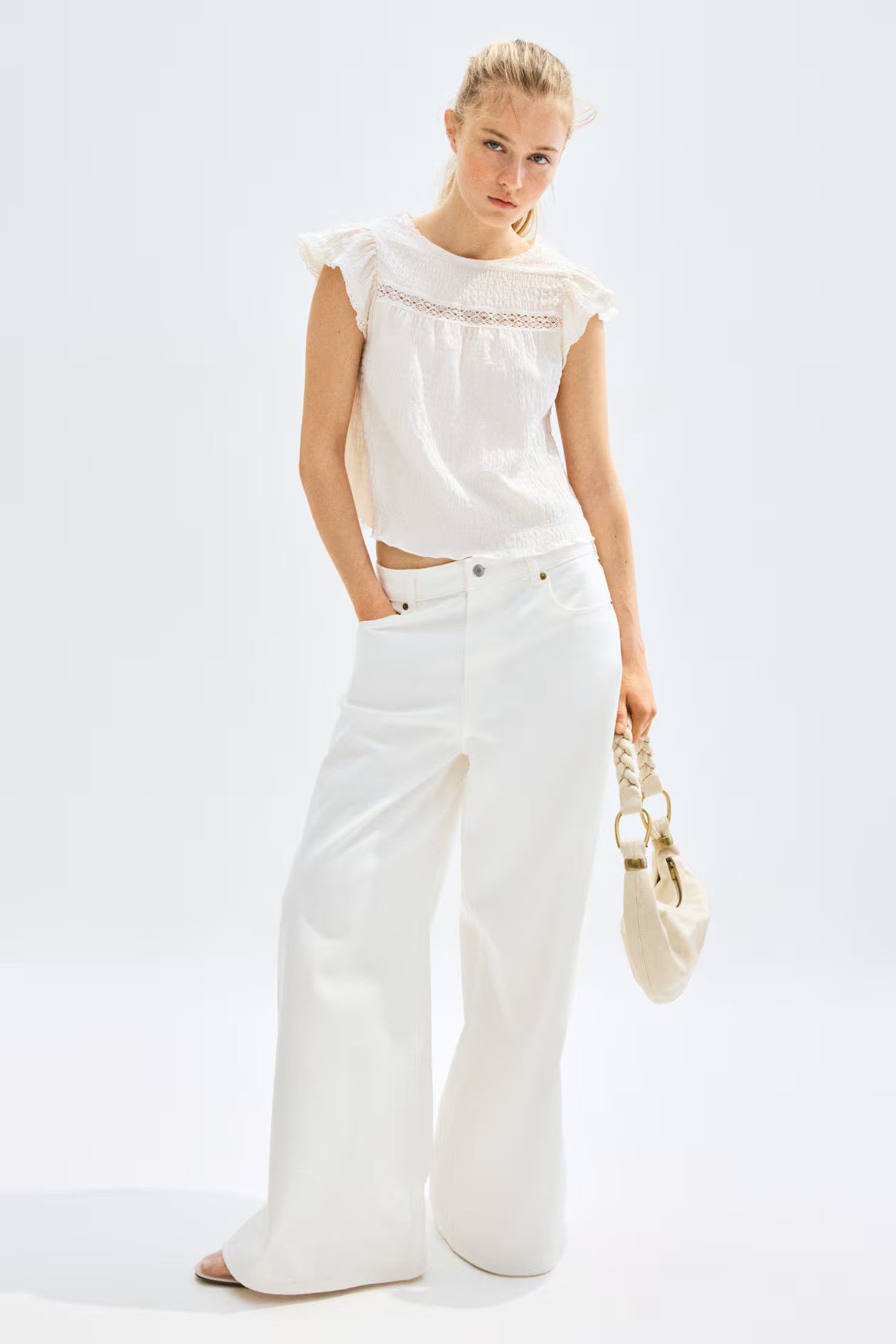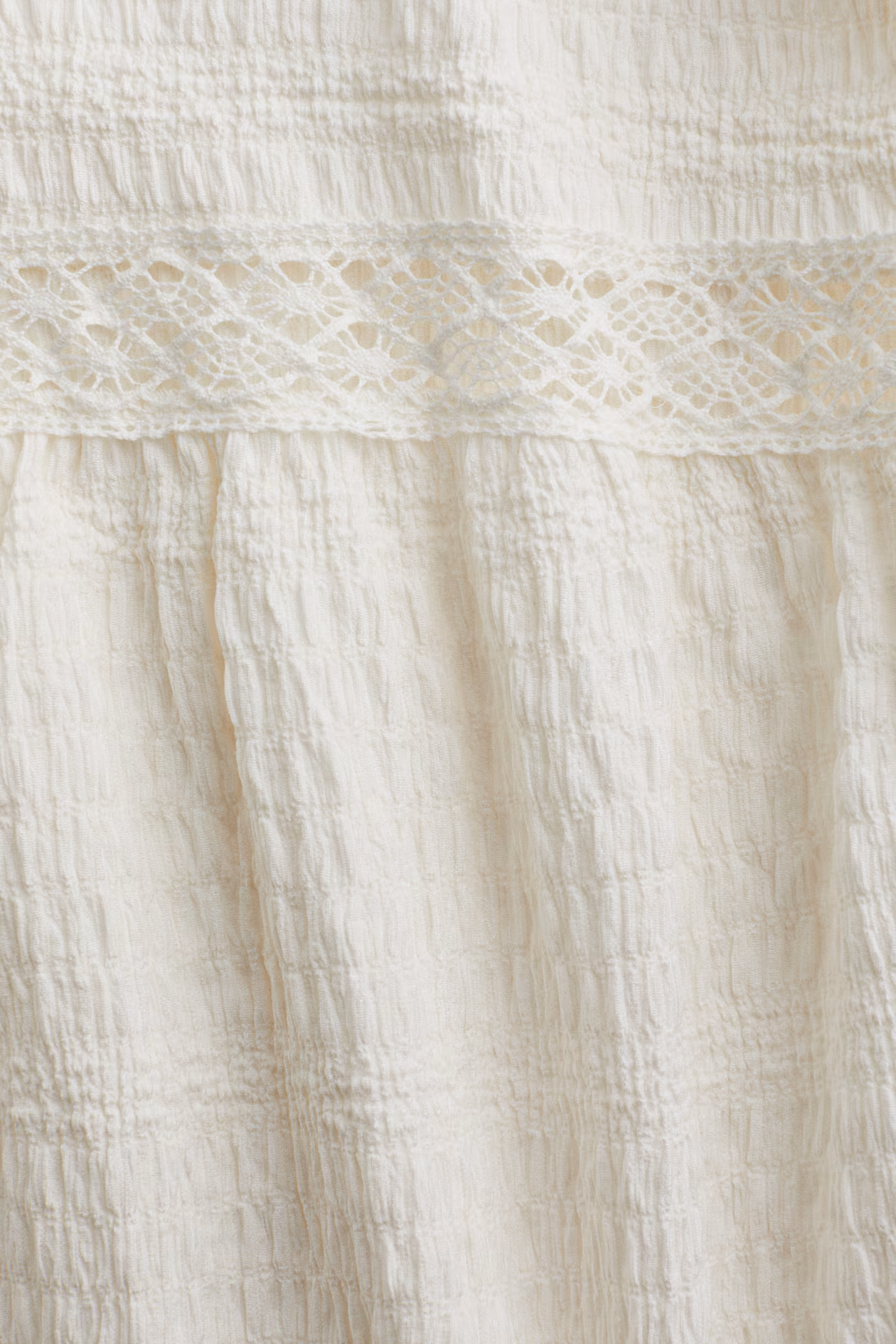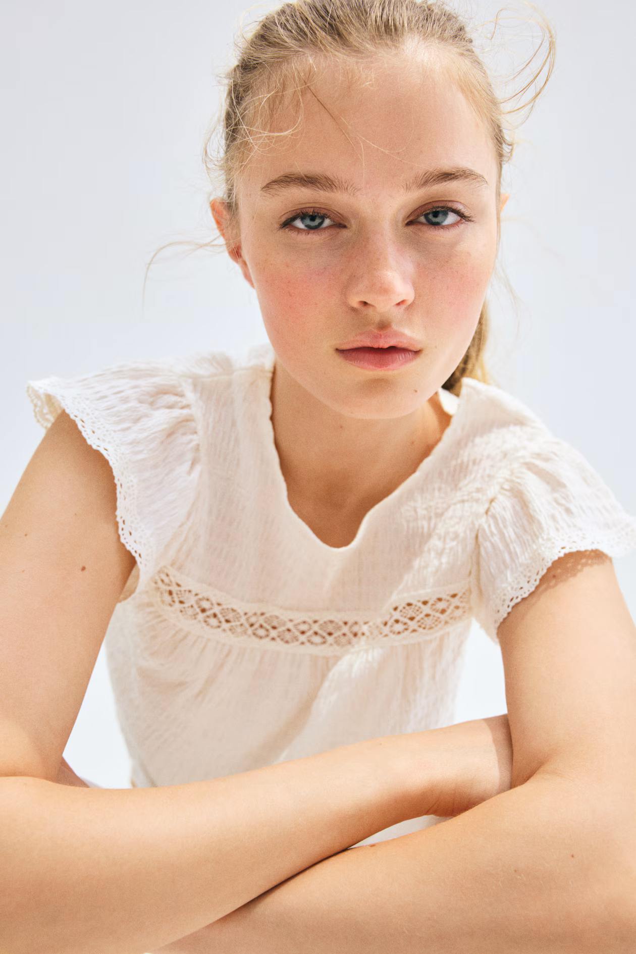 Short top in soft, textured jersey. Round neckline, lace inset and gathered seam above bust, and flutter sleeves with delicate lace trim.