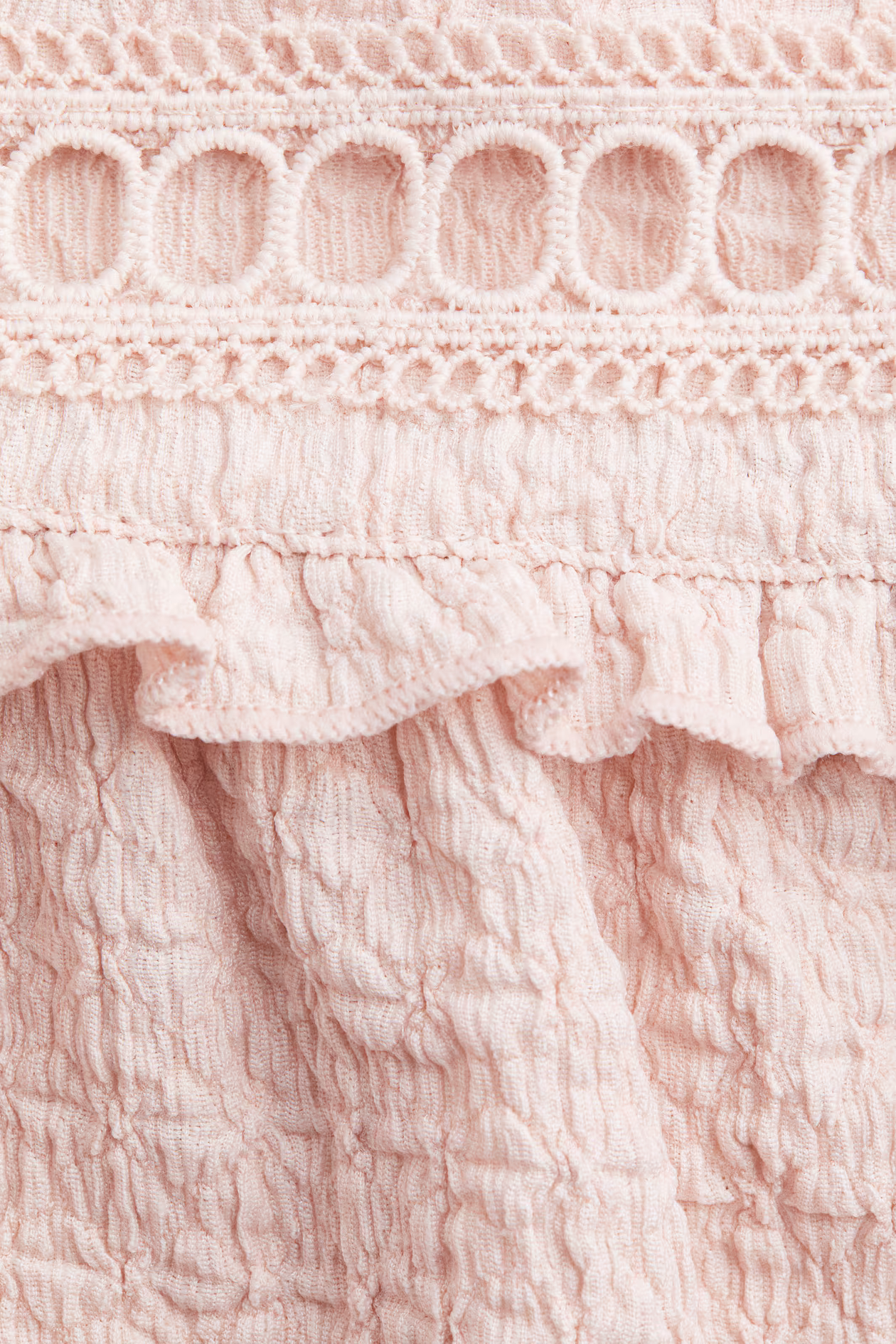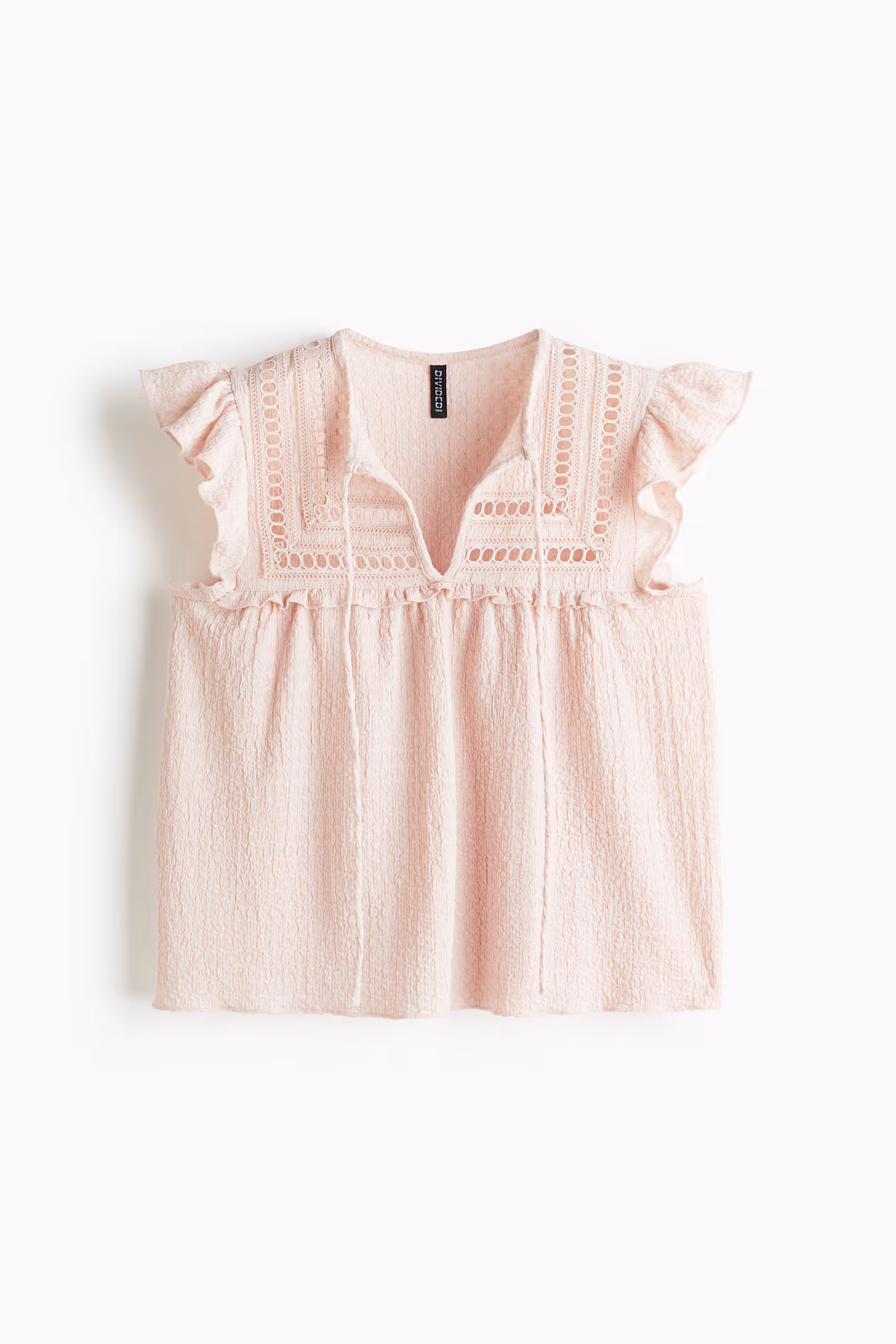 Loose-fit top in textured jersey. Round neckline, V-shaped opening at front with narrow ties, and flutter sleeves. Yoke at front with lace insets finished at lower edge with a gathered, ruffle-trimmed seam. Horizontal ruffle at back and a straight-cut hem.