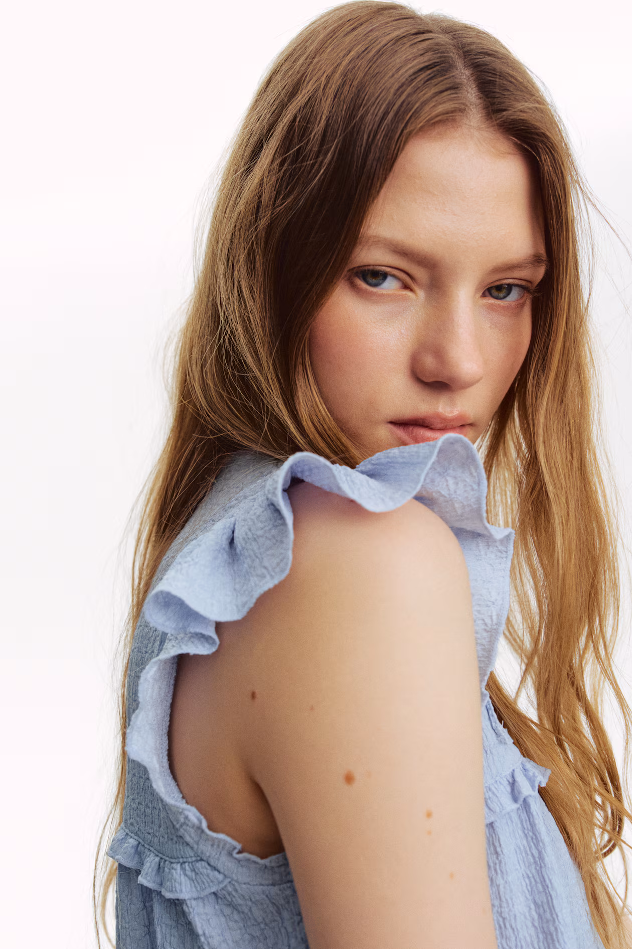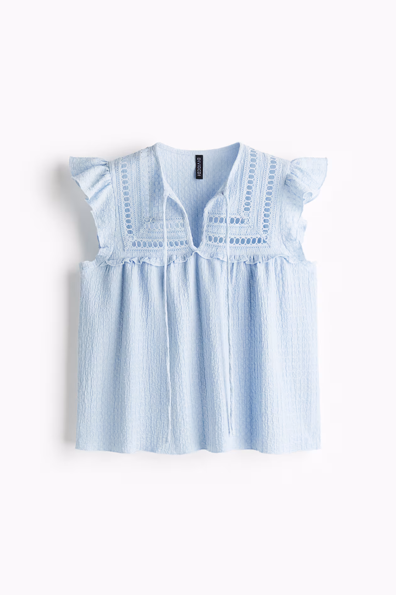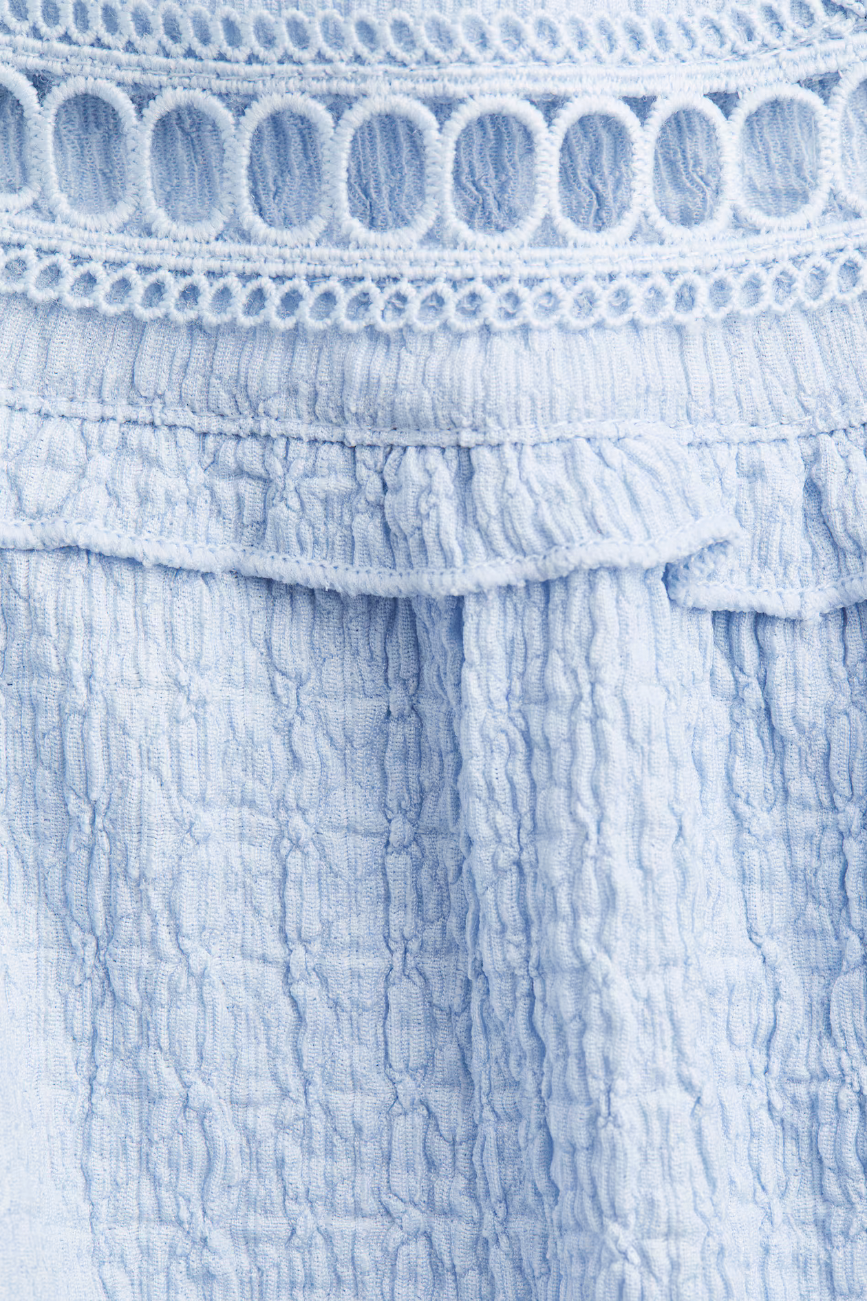 Loose-fit top in textured jersey. Round neckline, V-shaped opening at front with narrow ties, and flutter sleeves. Yoke at front with lace insets finished at lower edge with a gathered, ruffle-trimmed seam. Horizontal ruffle at back and a straight-cut hem.