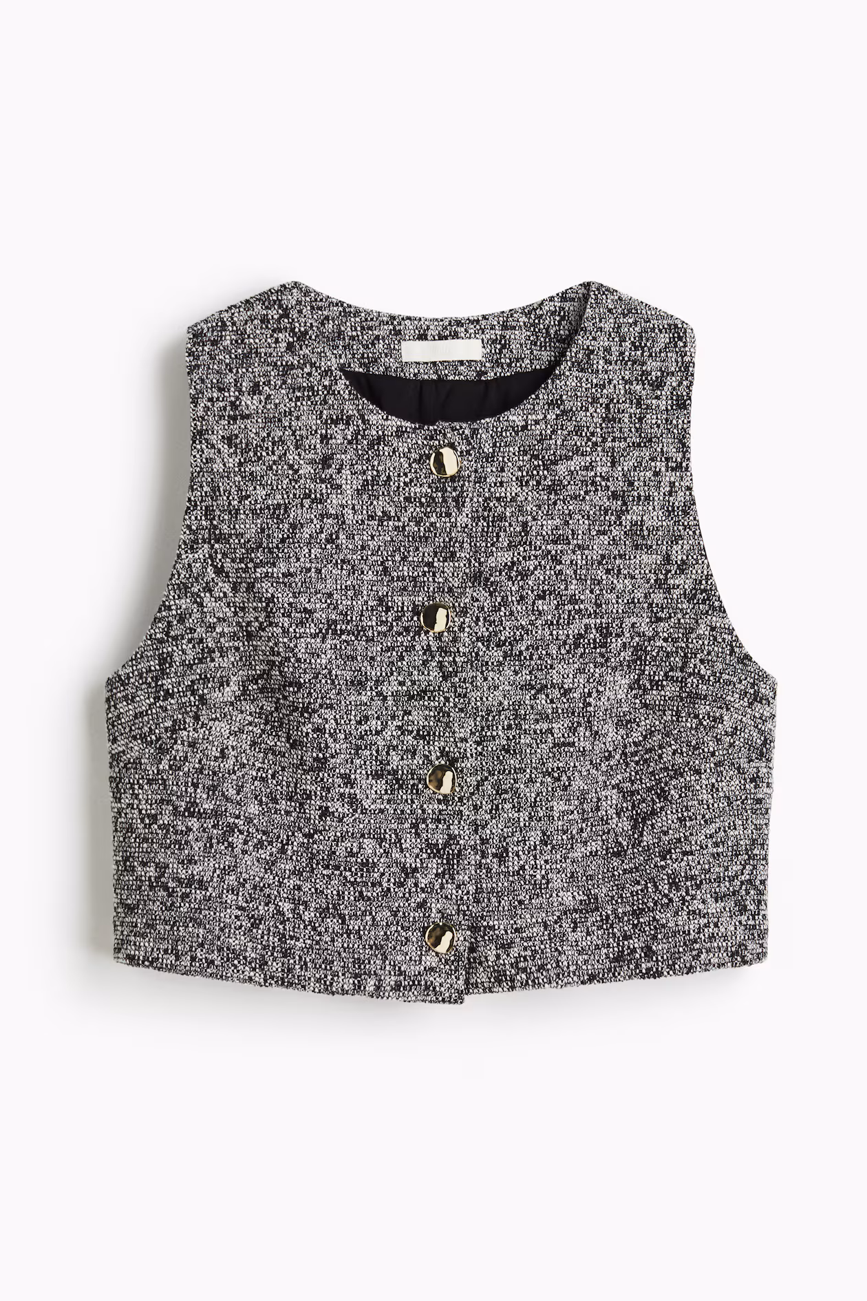 Cropped waistcoat in textured jersey. Loose fit with a round neckline, bust darts and irregular metal press-studs down the front. Lined.