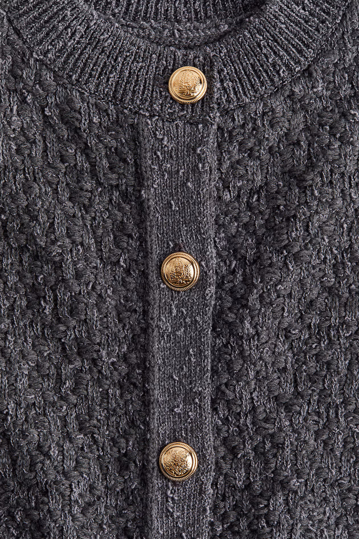 Cardigan in a textured knit. Round neckline, metal buttons at front with a motif, and long sleeves. Ribbing at neckline, cuffs, and hem.