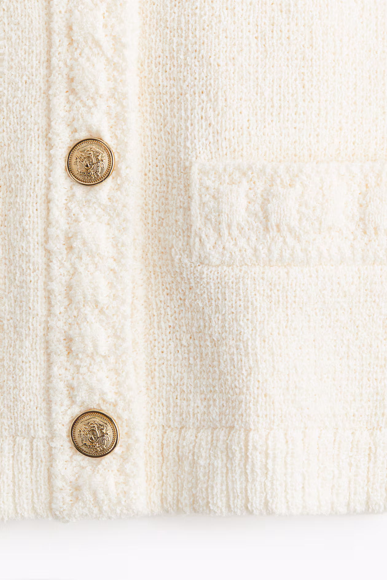 Short cardigan in a textured knit. Round neckline, metal buttons at front, and long sleeves. Mock welt chest pockets and mock welt front pockets.