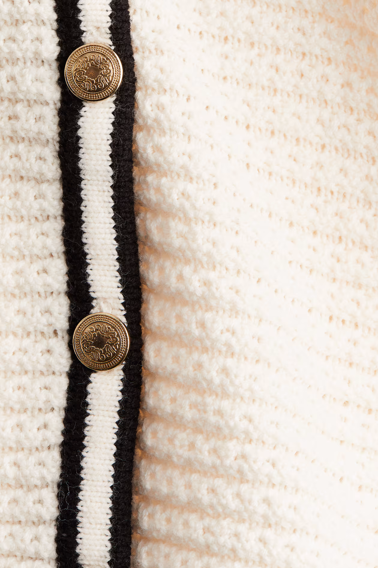 Textured-knit cardigan with accent-colored trim. Round, low-cut neckline, metal buttons at front, and long sleeves.