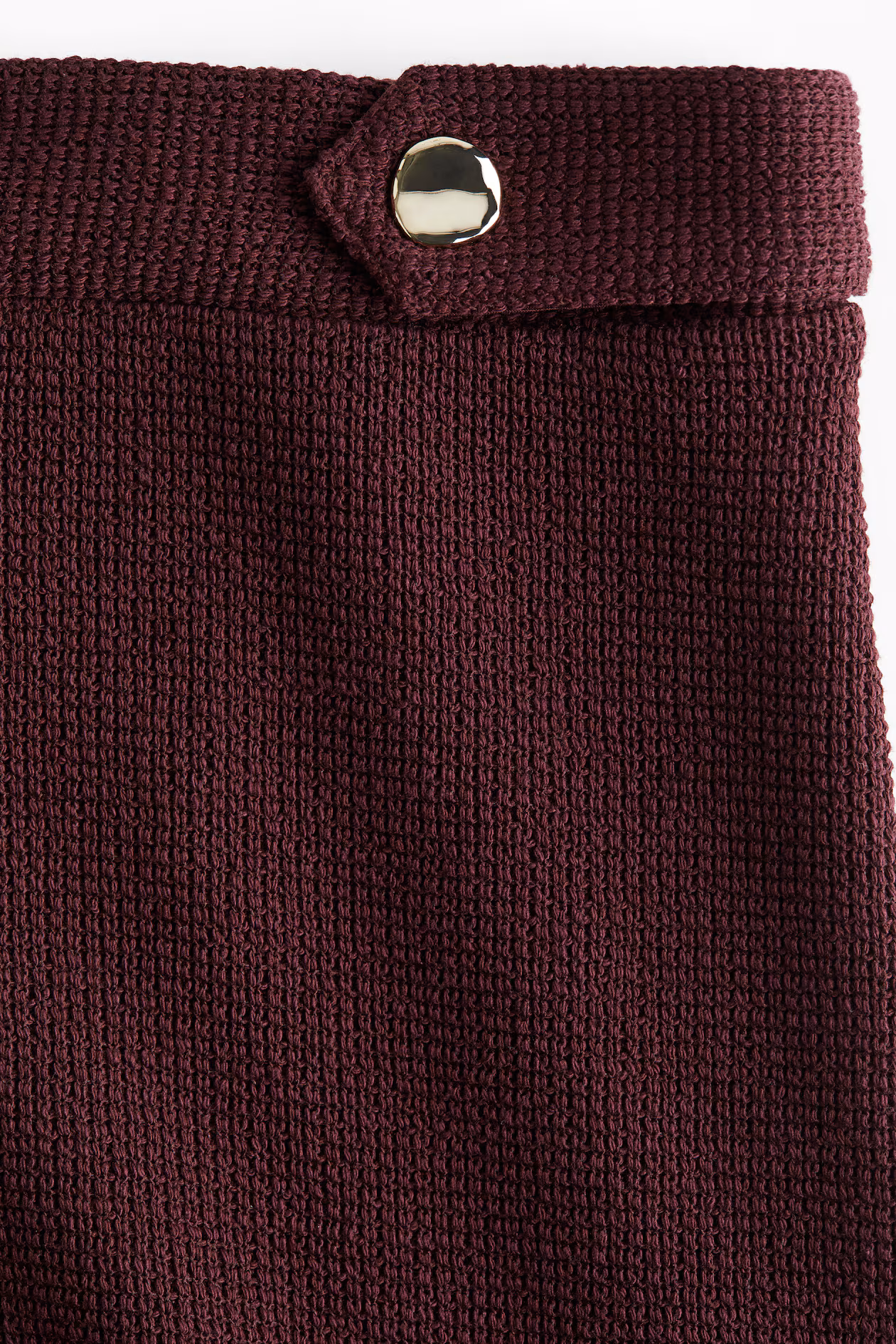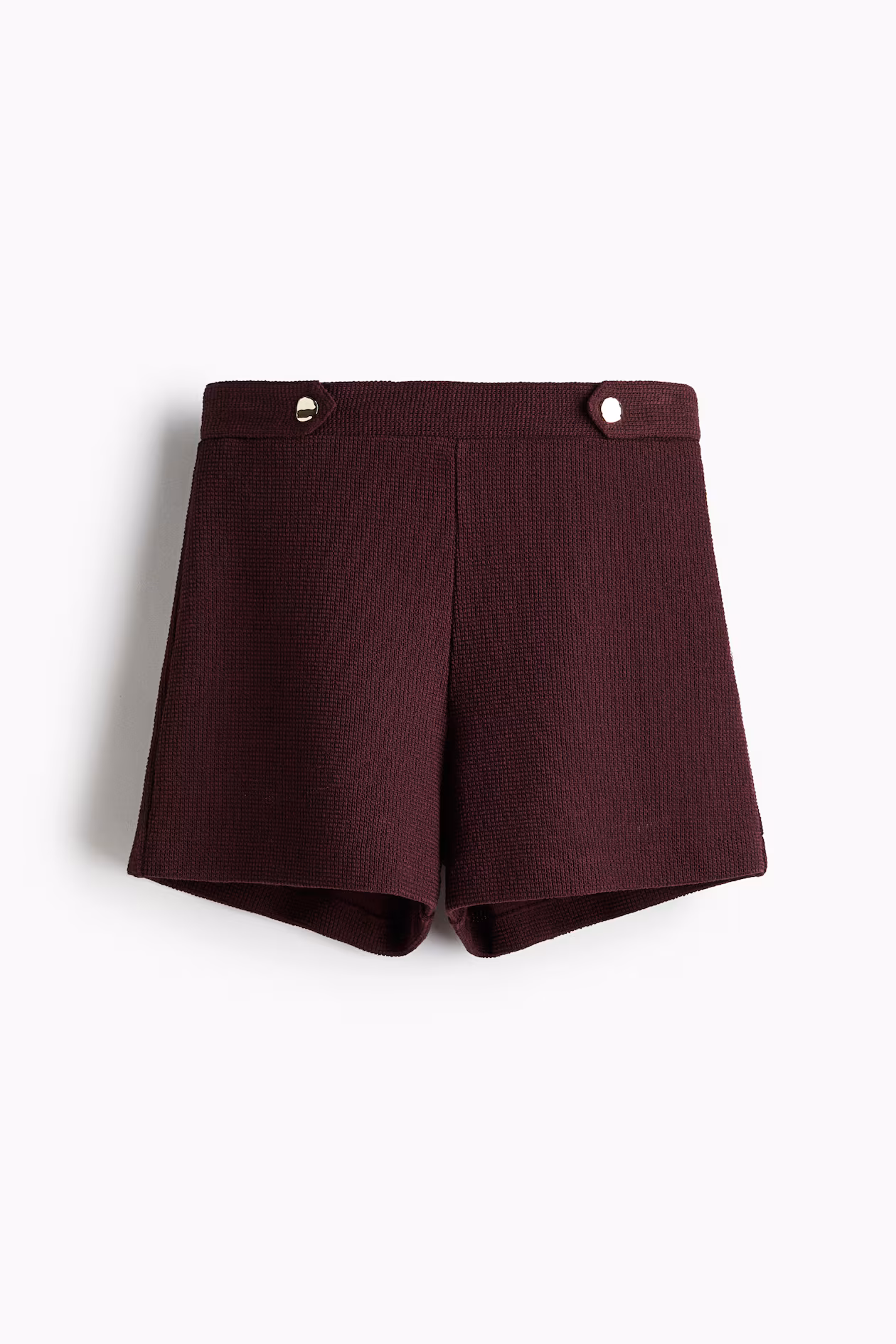 Shorts in a textured knit. High waist, concealed elastic at waistband, tabs at front with snap fastener, and a concealed zipper at one side.