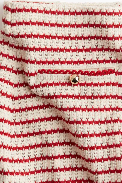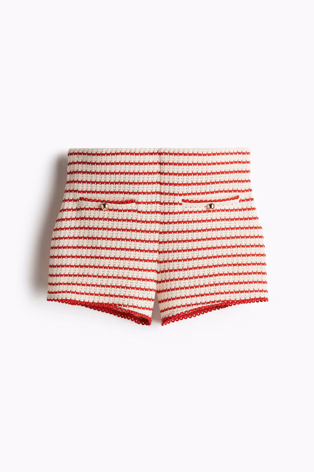 Fitted shorts in a textured-knit cotton blend. High waist, concealed elastic at waistband, and mock welt front pockets with a shiny metal button.
