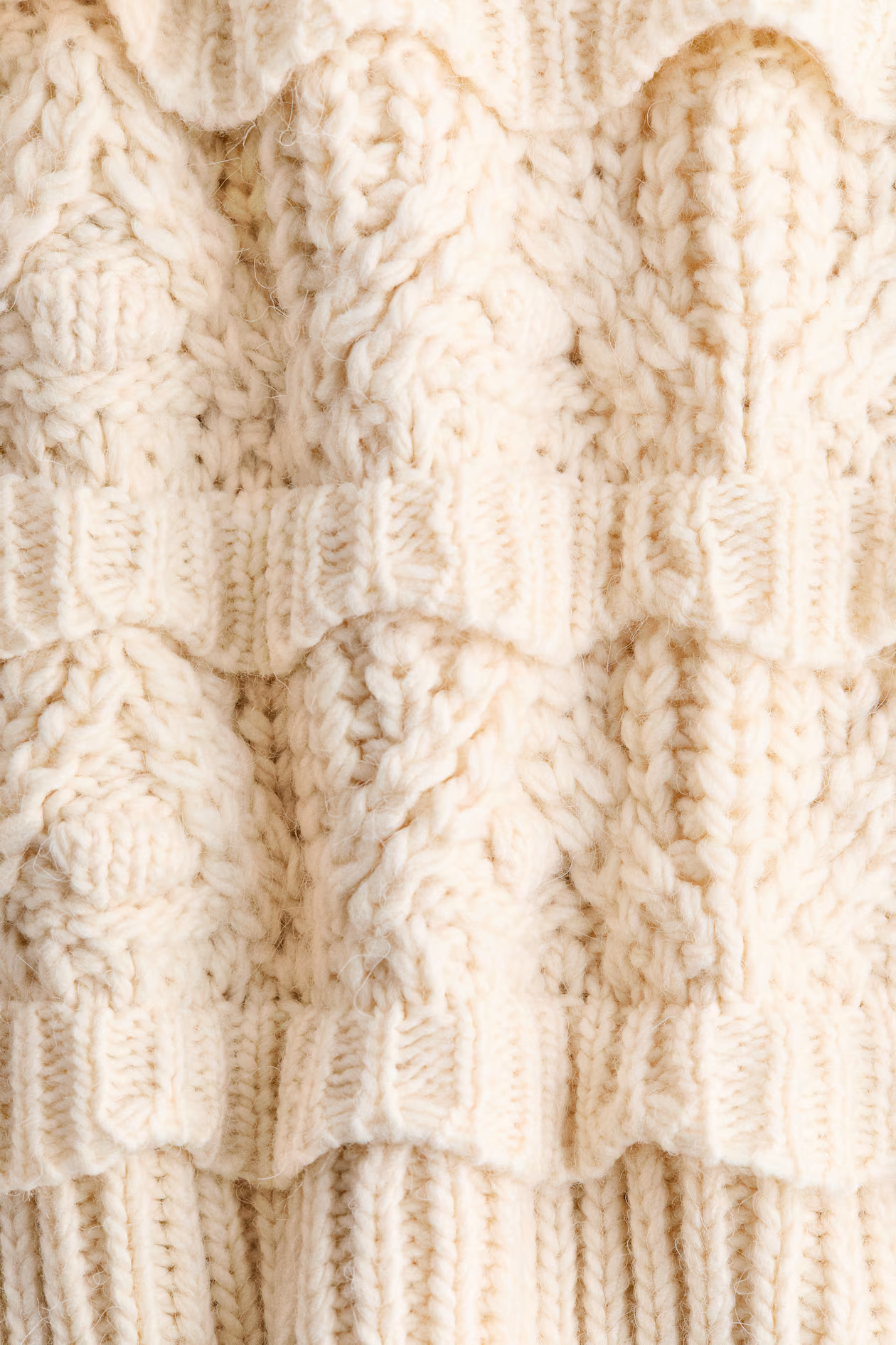 Soft, textured-knit sweater with ruffle trim. Round, ribbed neckline, long raglan sleeves, and scalloped-edge ribbing at cuffs and hem.
