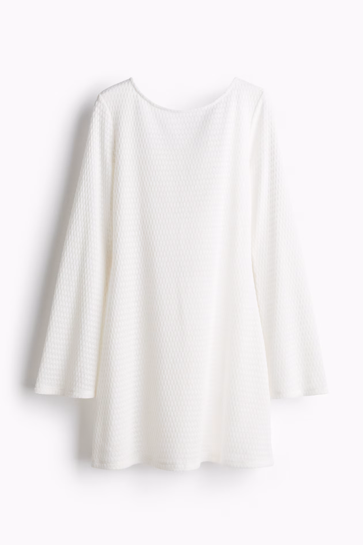 Short, fitted beach dress in a sheer knit. Round neckline at front and a low-cut back with decorative, extra-narrow crossover ties at back with plastic beads at ends. Long, flared sleeves and a gently flared skirt.