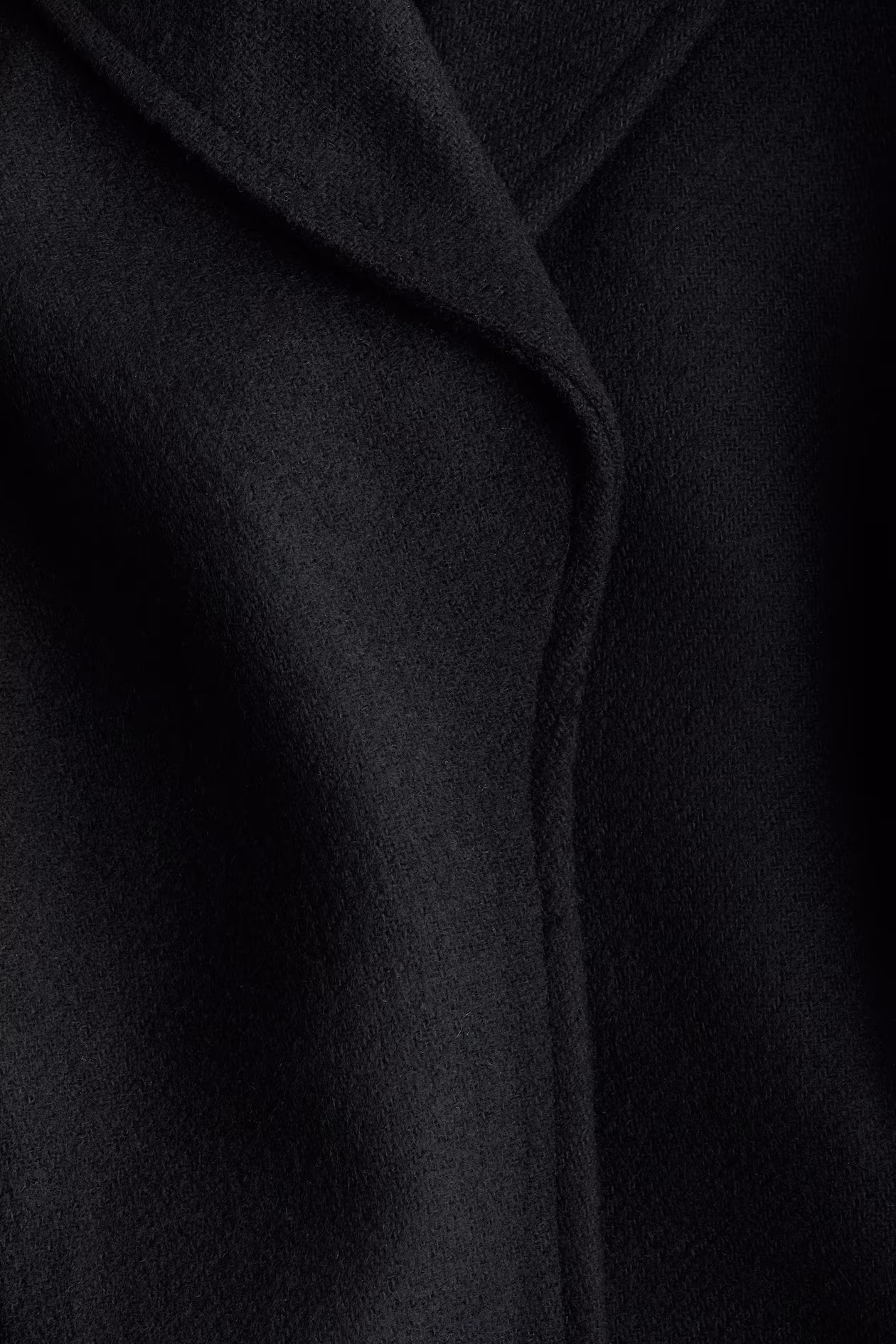 Coat in woven fabric with an open front. Notched lapels, patch front pockets, and a narrow tie belt at waist. Long raglan sleeves. Lined.