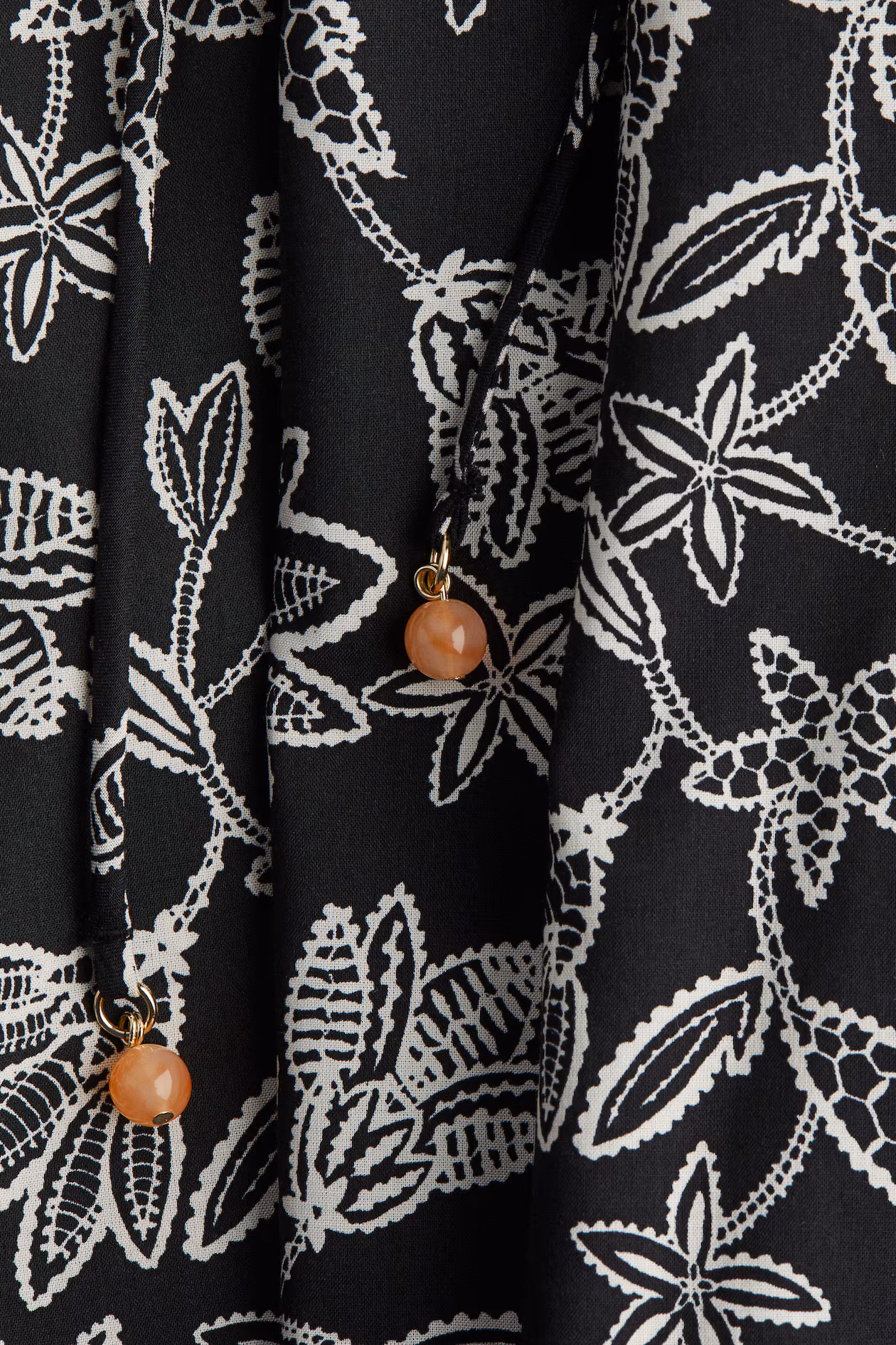 Short dress in a woven cotton and viscose blend. Band collar, buttons at top, and a narrow, removable tie belt at waist. Elbow-length raglan balloon sleeves with elasticized cuffs. Unlined.