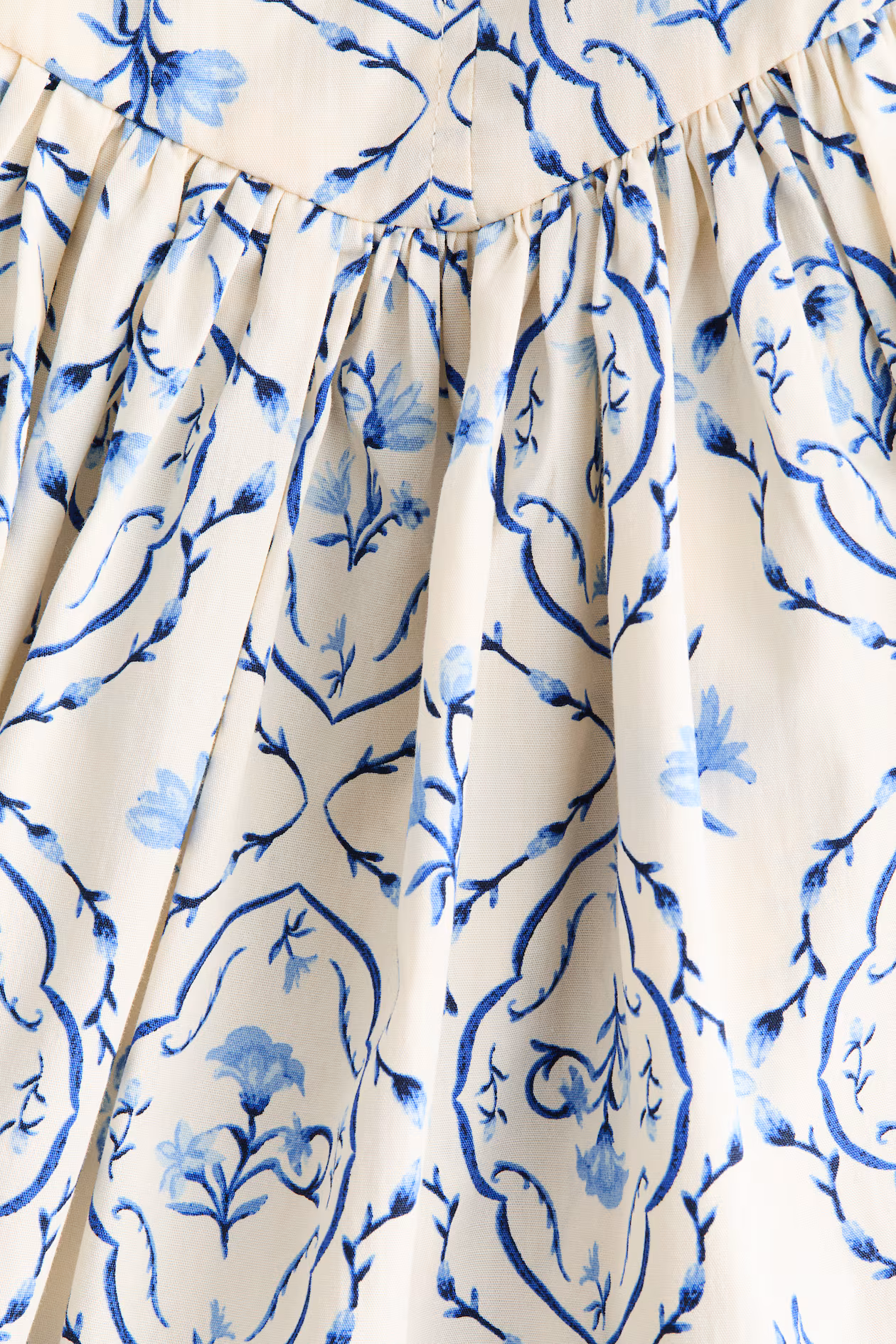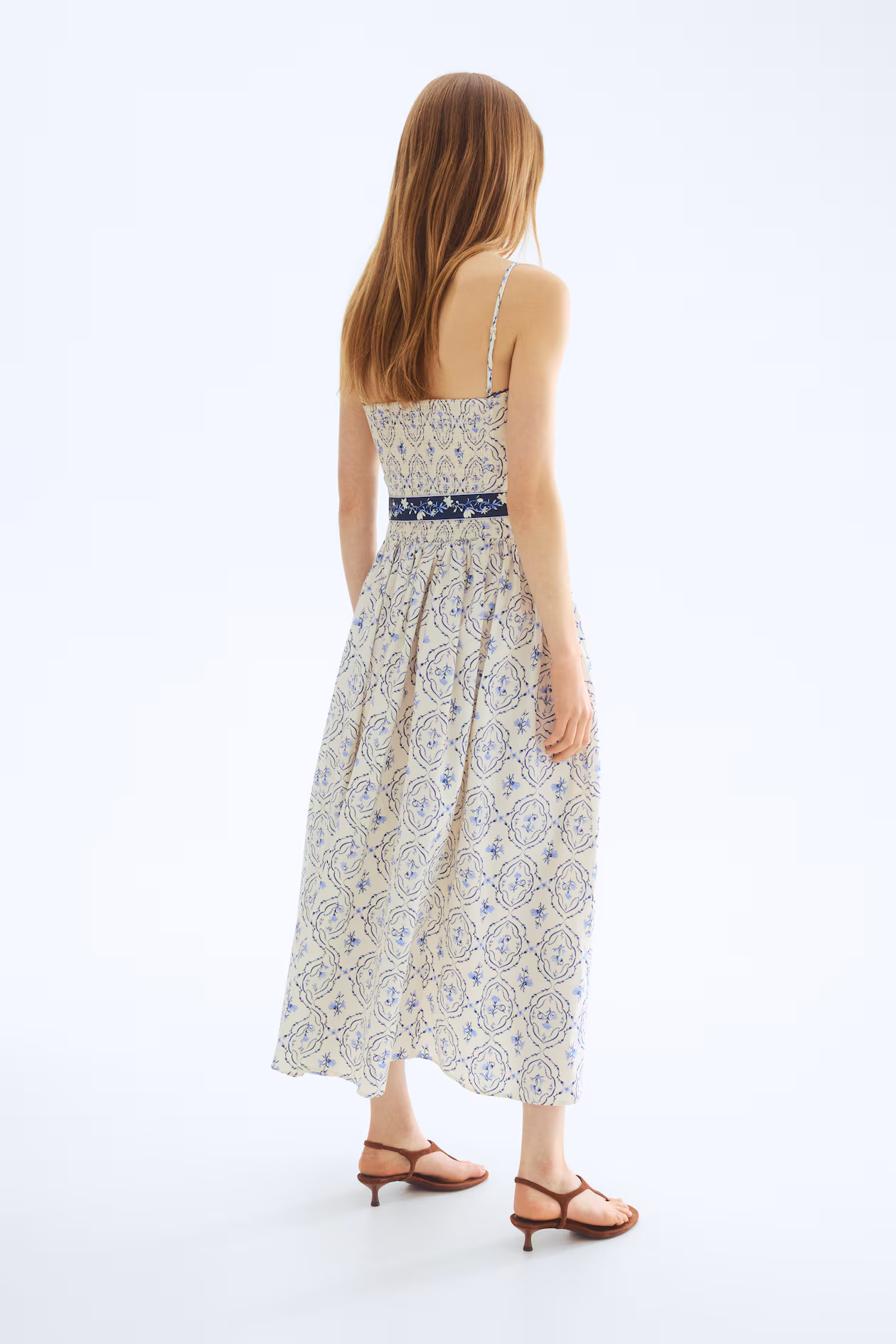 Ankle-length dress in crisp cotton poplin with a fitted bodice and gently flared skirt. Narrow, adjustable shoulder straps and a straight neckline with scalloped trim. Smocking at back, tie belt at waist, and a gathered seam at hips. Partly lined.