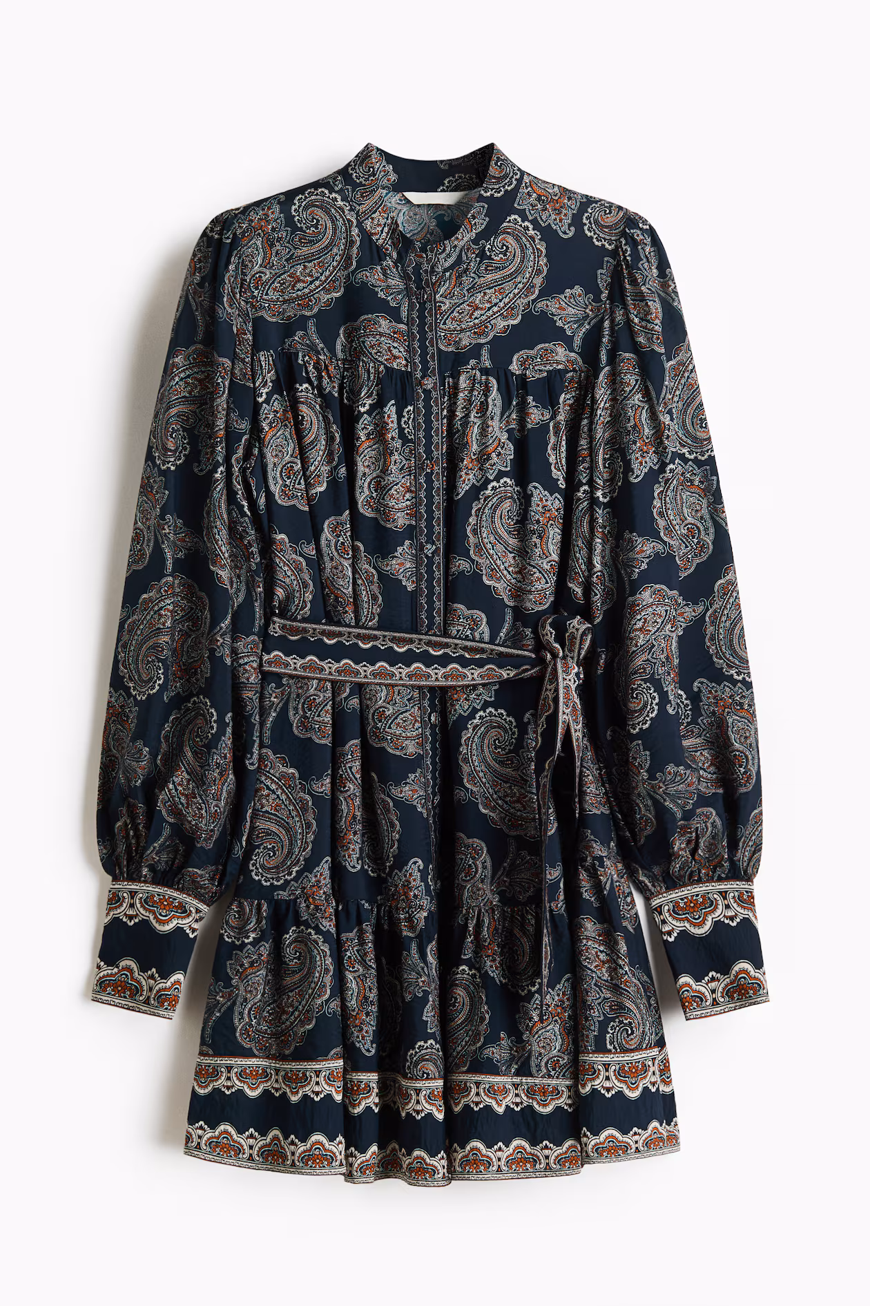 Short, oversized dress in a woven viscose blend with a printed pattern. Band collar, covered buttons at front, and yoke at front and back with gathers. Removable tie belt, long sleeves with button at cuffs, and a gathered seam above hem for a tiered look. Unlined.