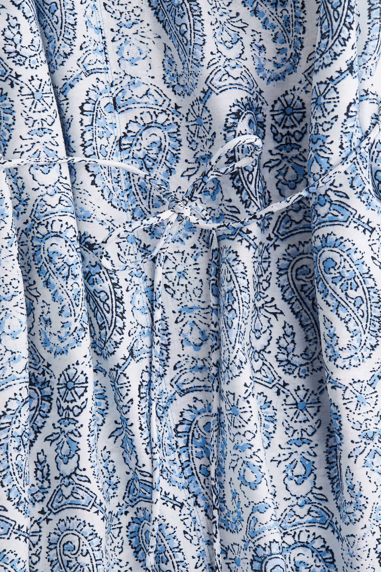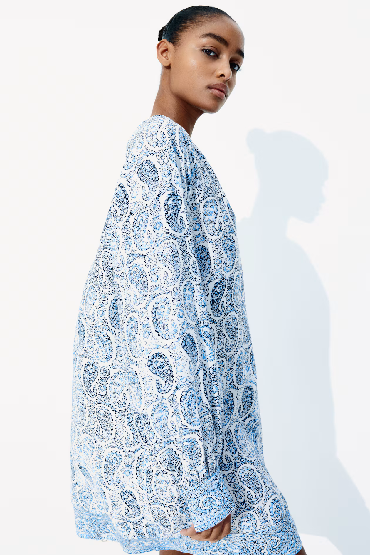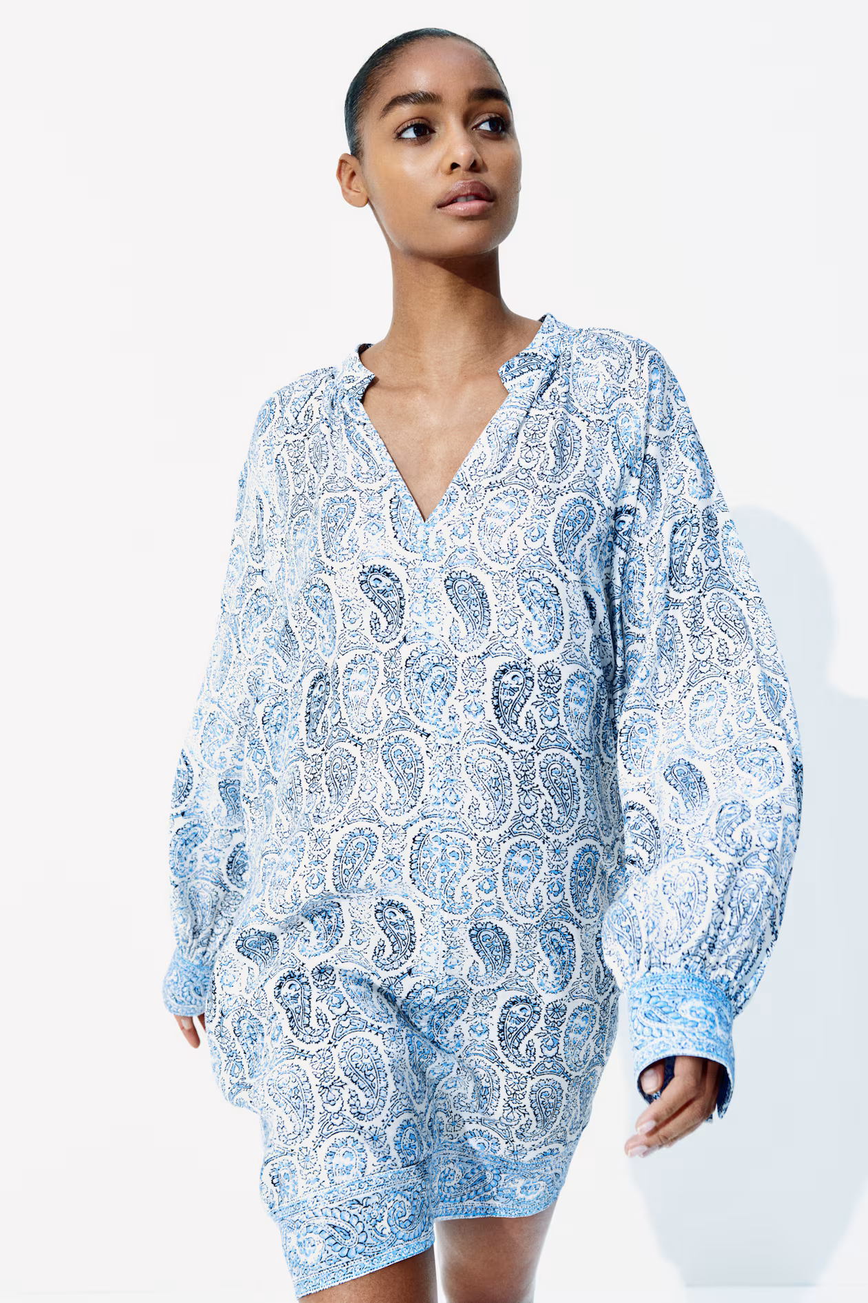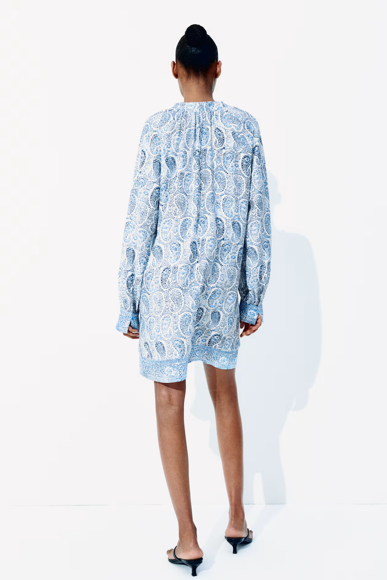 Short, loose-fit dress in a woven viscose blend. Gathered band collar, V-shaped opening at front, and a narrow, removable tie belt at waist. Long raglan balloon sleeves and cuffs with a slit and button. Unlined.