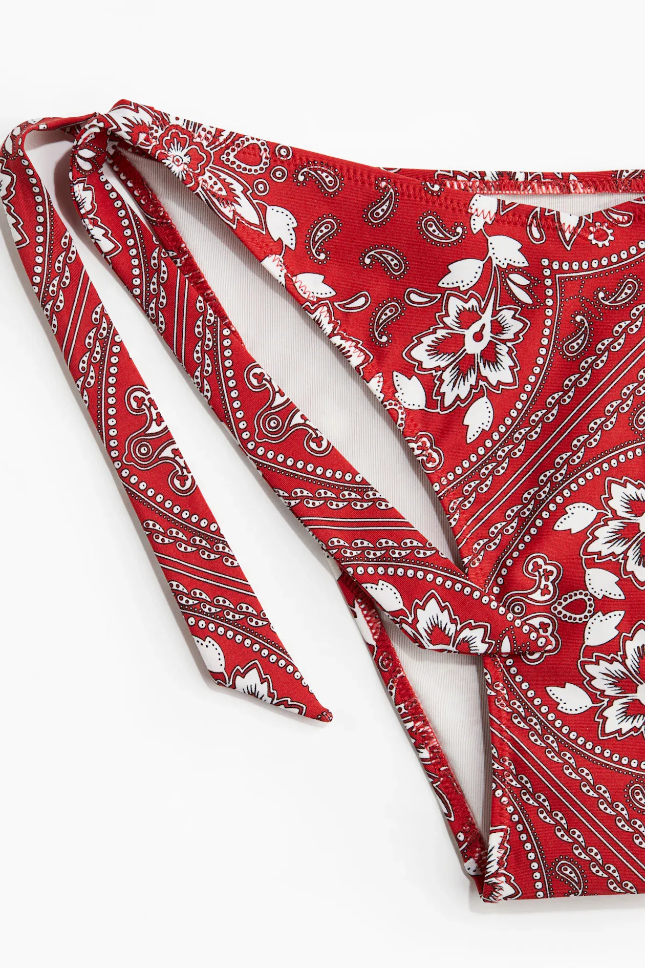 Fully lined bikini bottoms. Mid-rise, V-cut waist, ties at sides, and cutaway coverage at back.