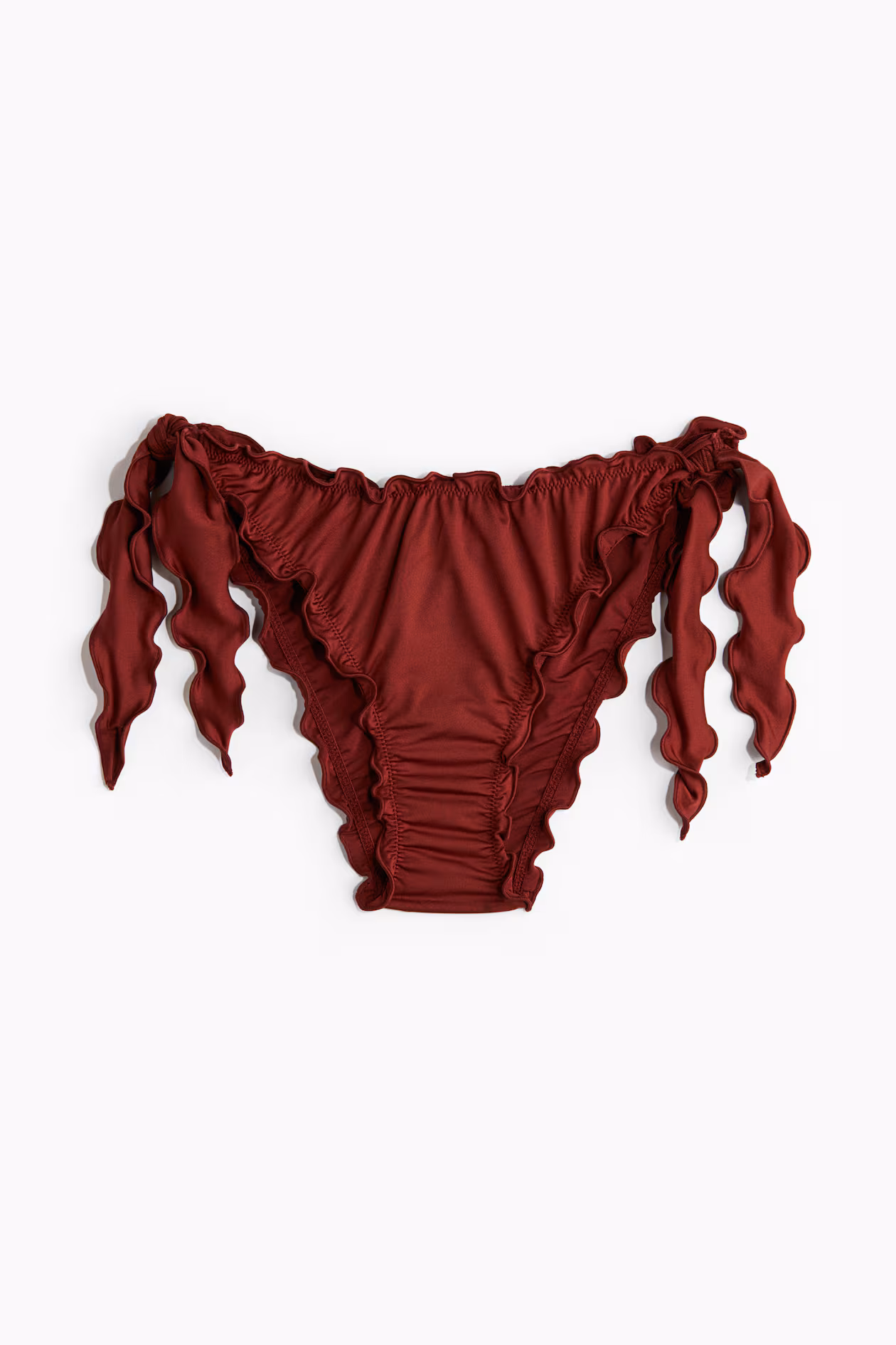 Fully lined bikini bottoms with overlocked edges. Mid-rise waist, ties at sides, and cutaway coverage at back.
