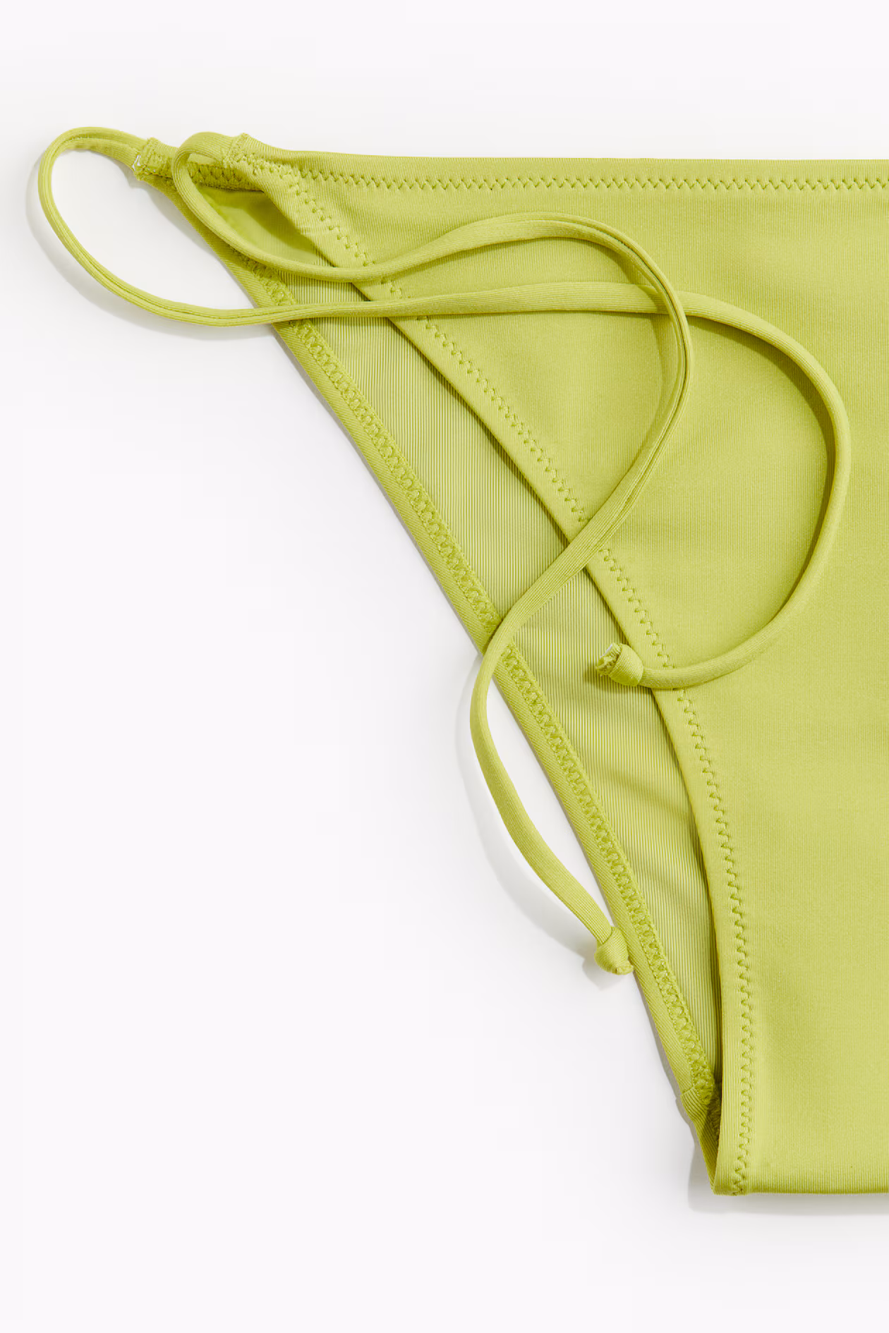 Fully lined bikini bottoms. Mid-rise waist, ties at sides, and cutaway coverage at back.