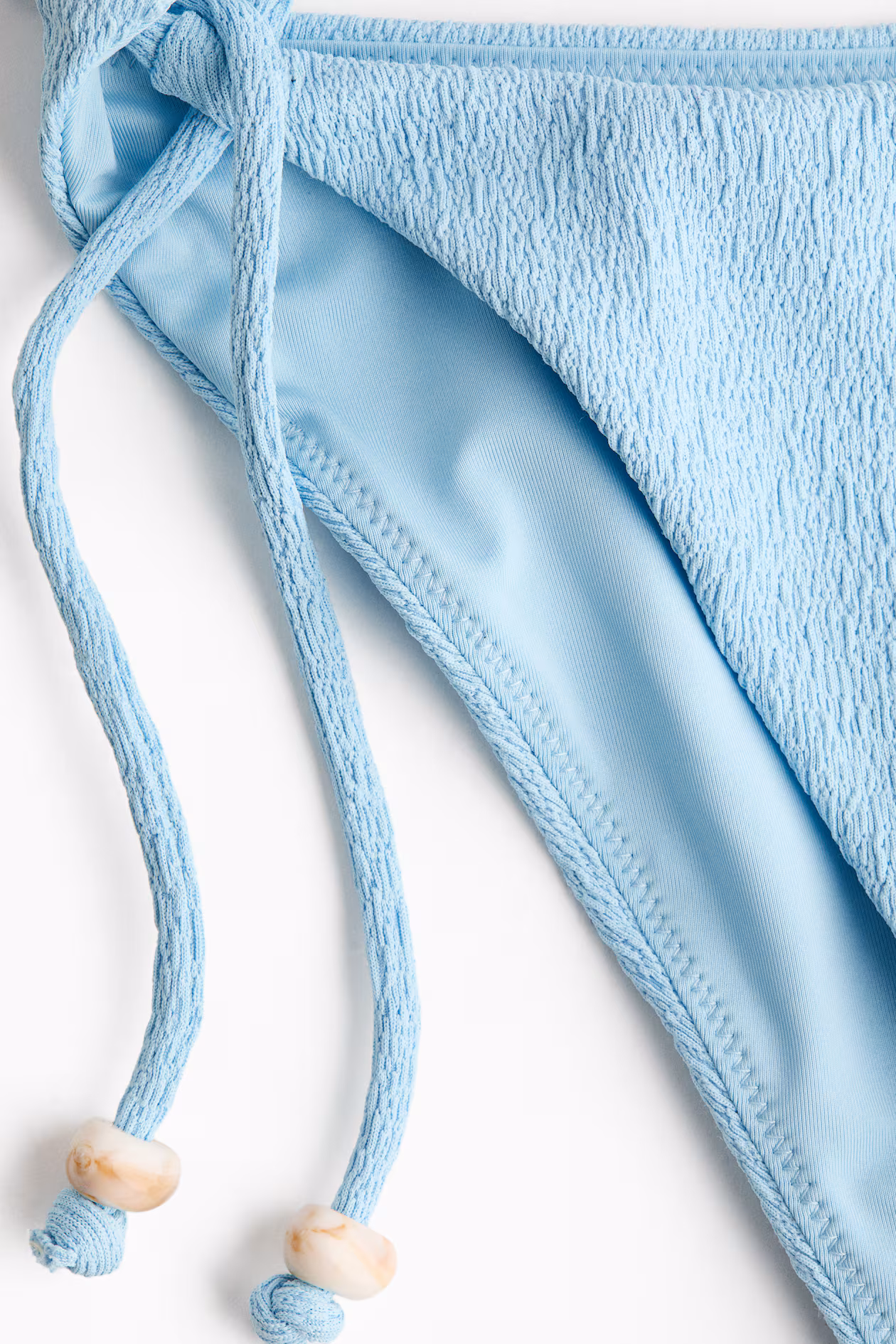 Fully lined bikini bottoms. Mid-rise waist, beaded-end ties at sides, and cutaway coverage at back.