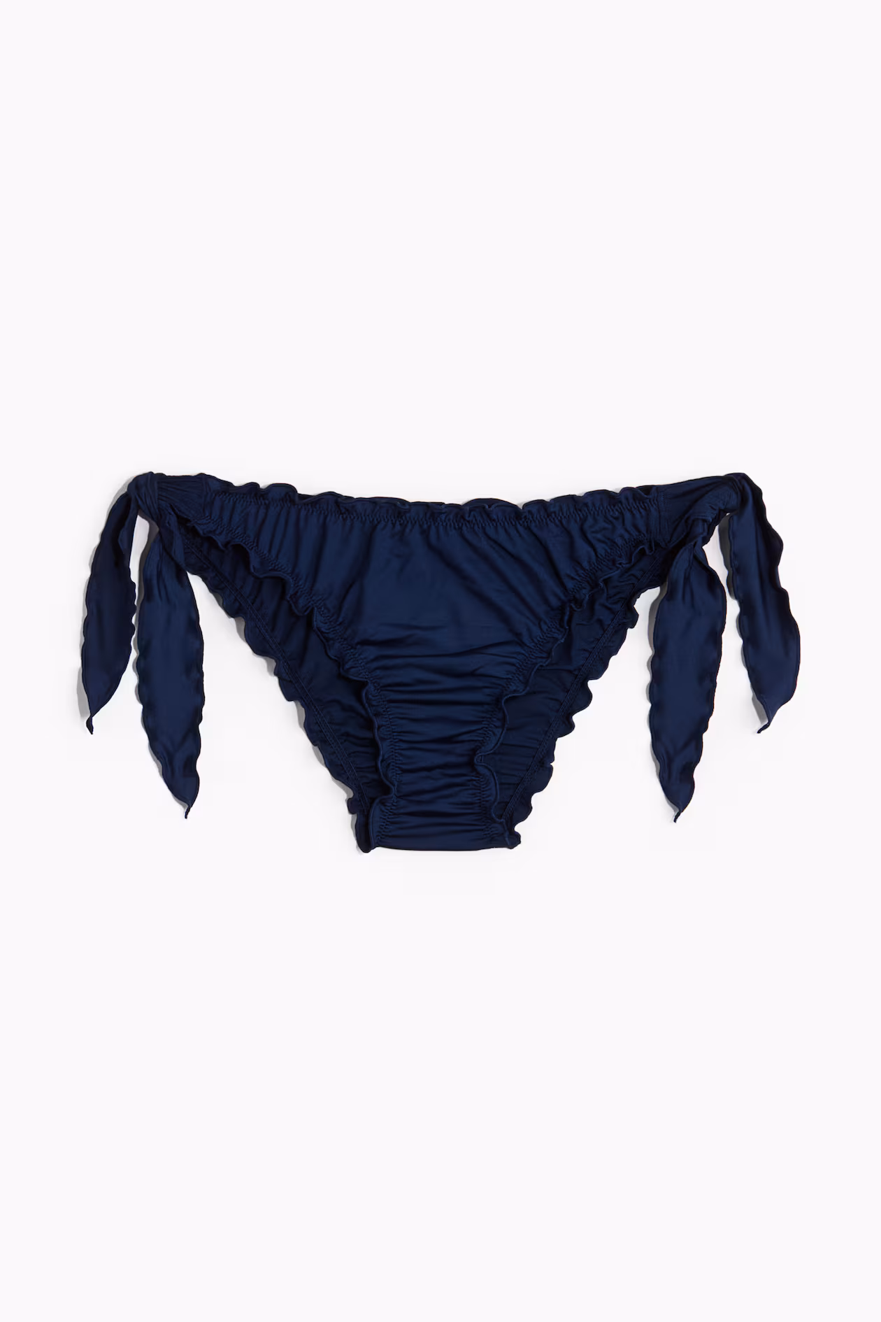 Fully lined bikini bottoms with overlocked edges. Mid-rise waist, ties at sides, and cutaway coverage at back.