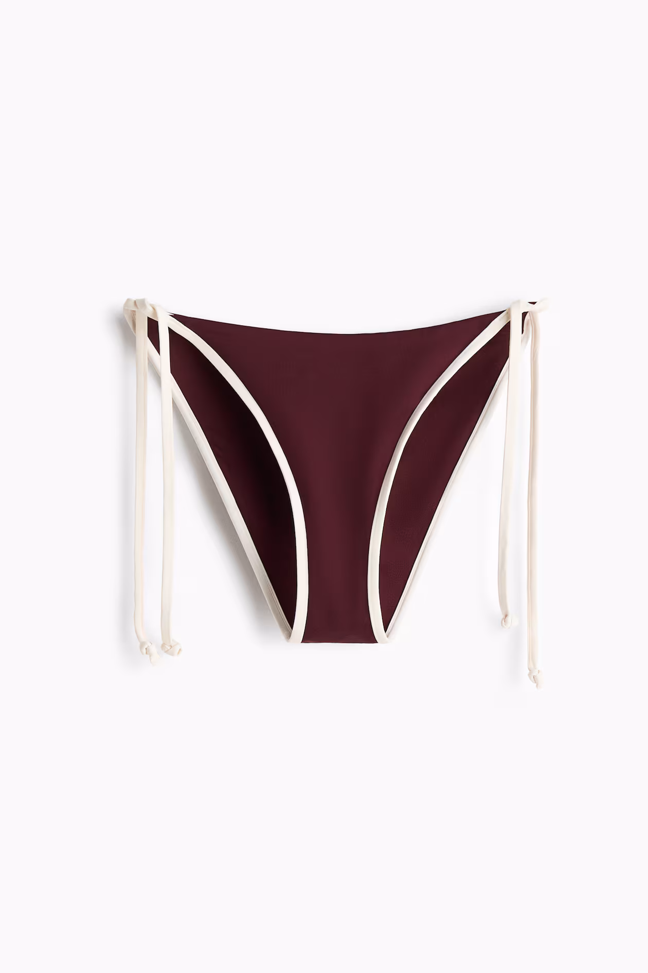 Fully lined bikini bottoms. Mid-rise waist, ties at sides, and cutaway coverage at back.