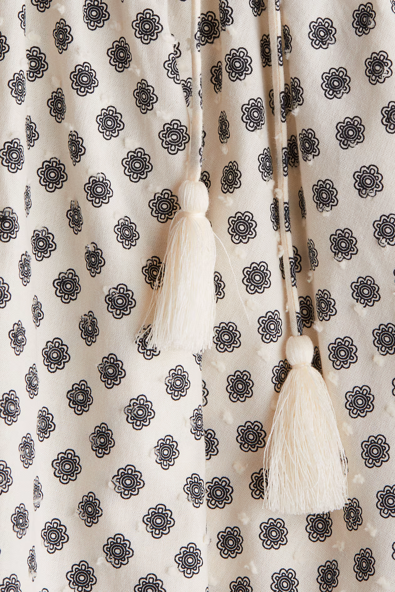 Short, loose-fit, slightly A-line dress in airy woven cotton. Band collar, V-shaped opening at front with narrow, tasseled-ended ties, and gathered seam at front and back of waist. Long balloon sleeves with narrow elastic at cuffs. Unlined.