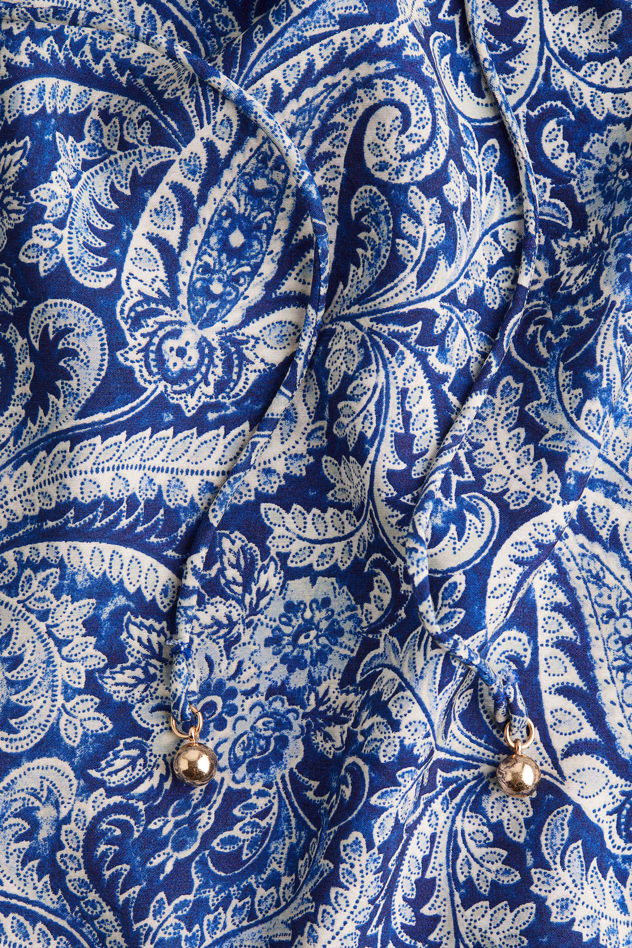 Short A-line dress in woven fabric. Wide, low-cut neckline with ruffle trim and narrow, covered elastic. V-shaped opening at front with extra-narrow beaded ties. Short, lined balloon sleeves.