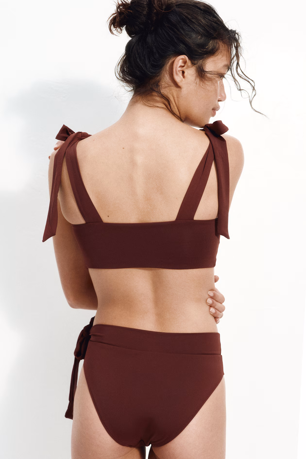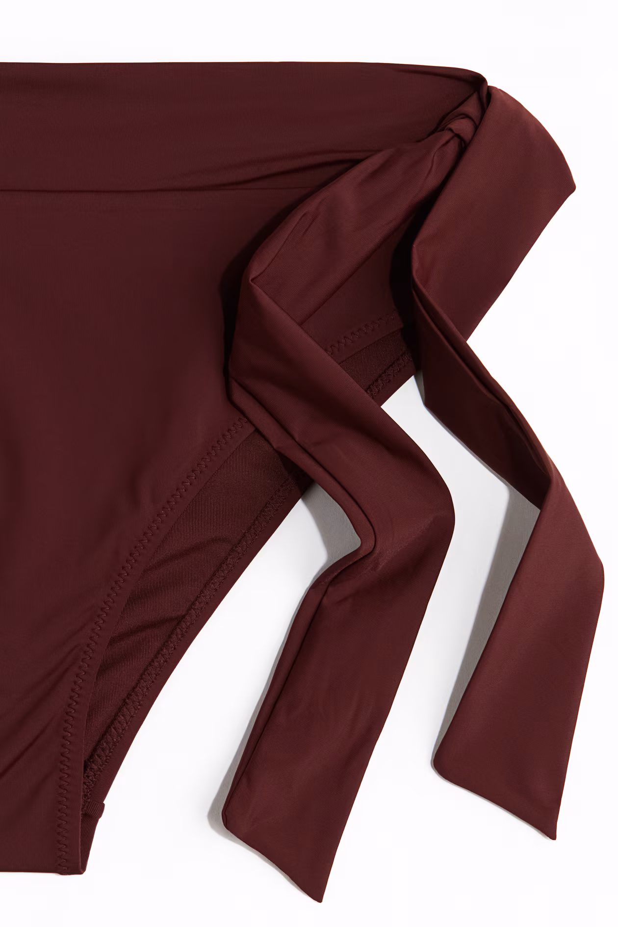 Fully lined bikini bottoms. High waist, waistband with gathers, and ties at one side. Cutaway coverage at back.