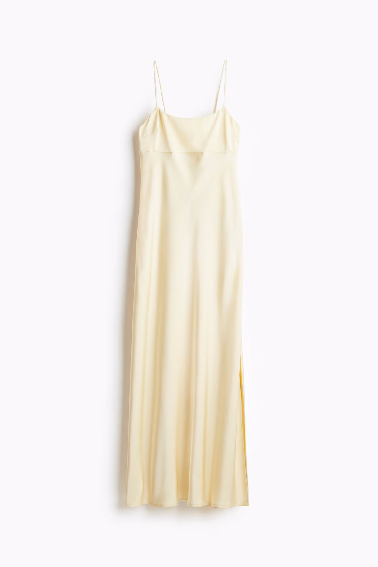 Fitted maxi dress in woven fabric. Adjustable, extra-narrow shoulder straps with ties threaded through loops at back. Square neckline at front, plunge back, and a concealed zipper at one side of bodice. High slit at one side of hem. Partly lined.