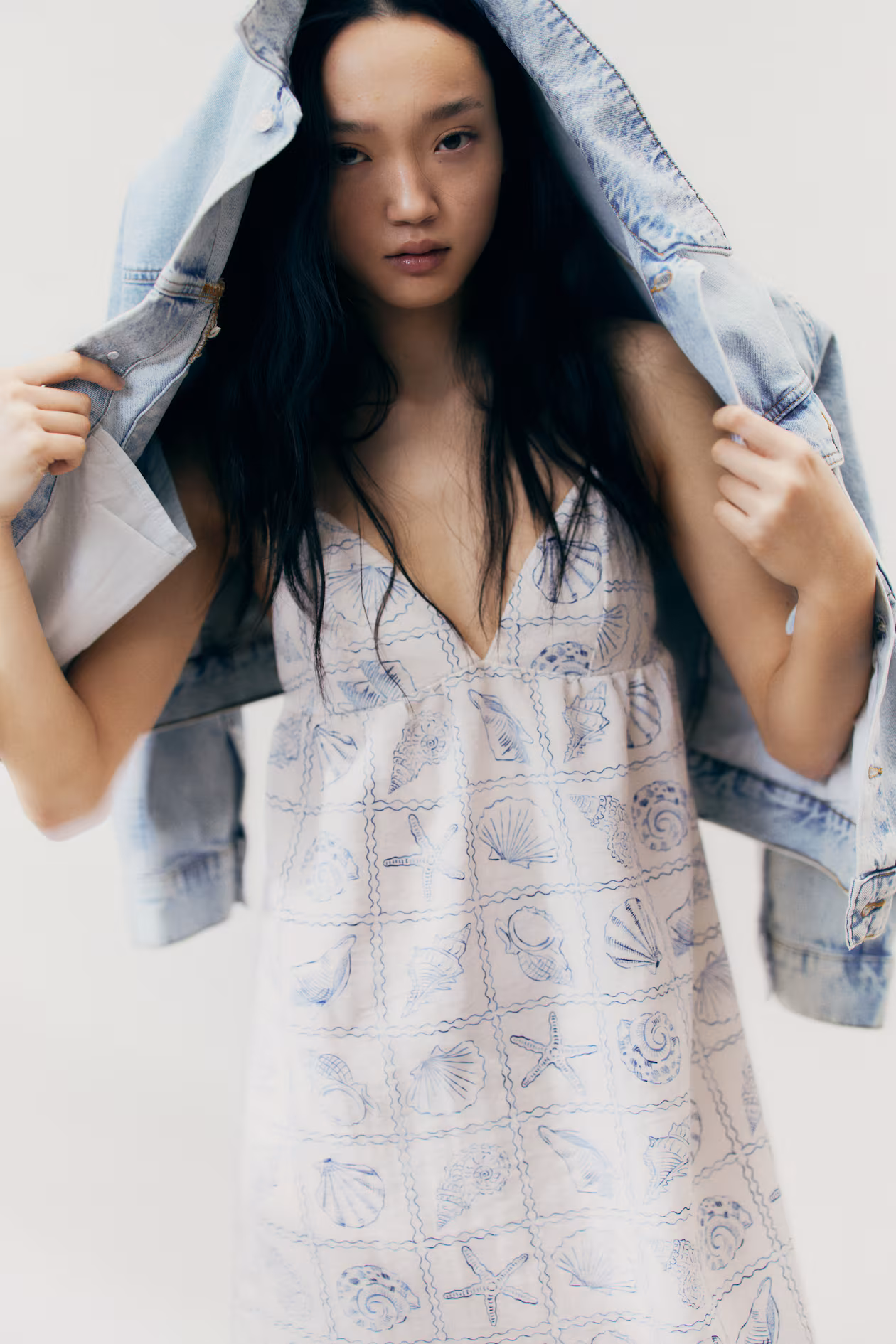 - Cream/blue, Patterned, Seashells