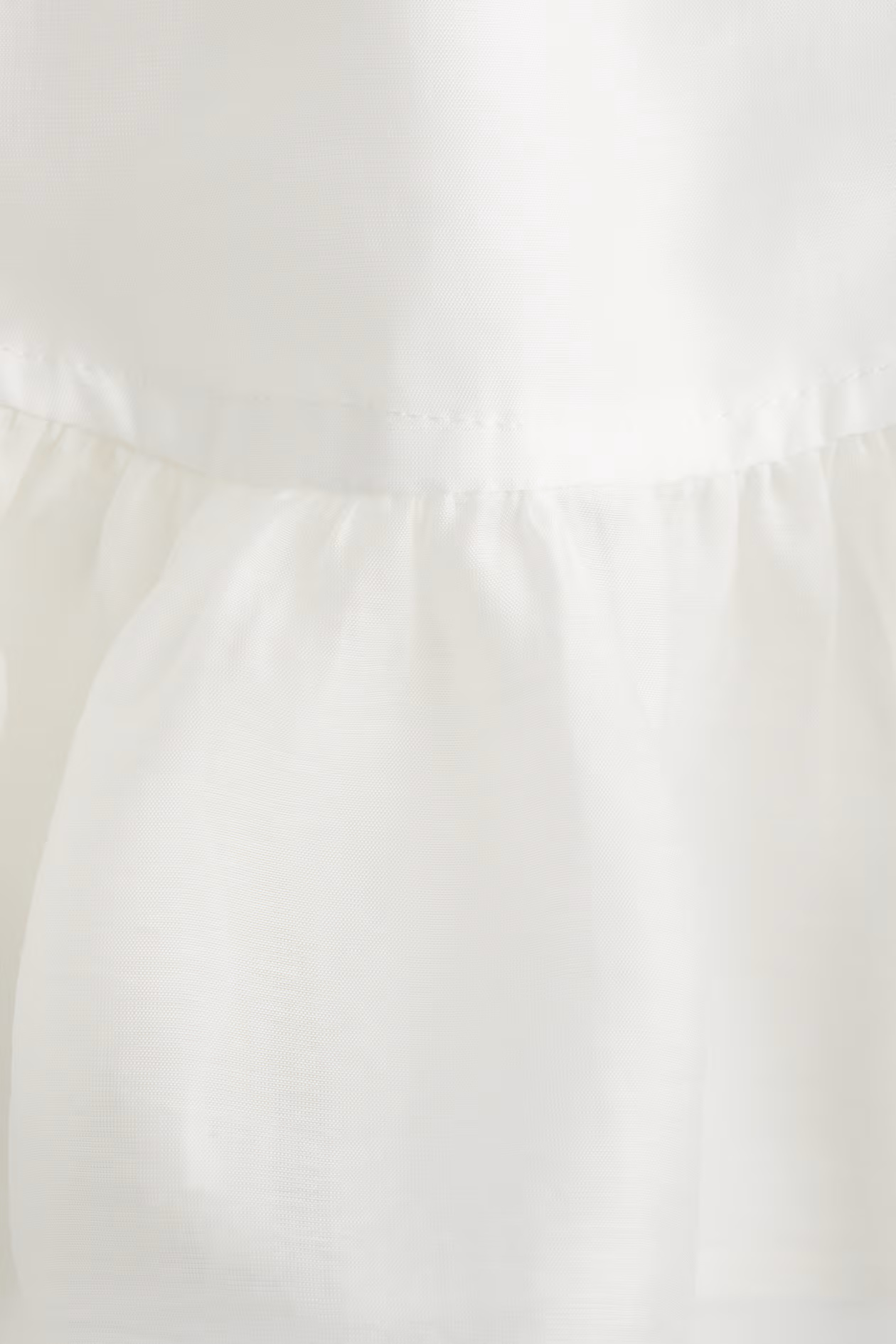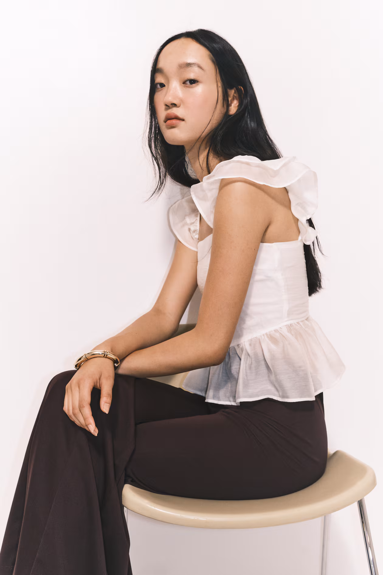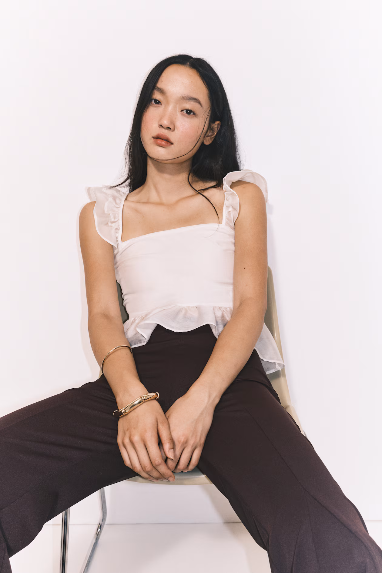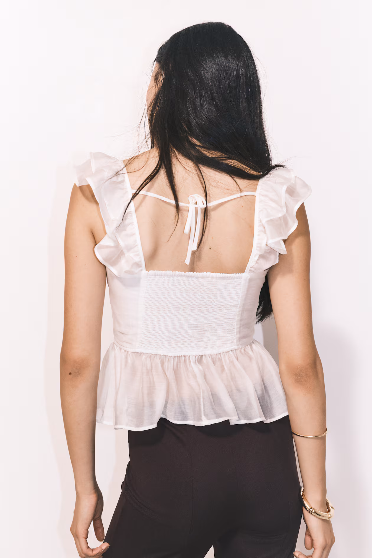 Fitted blouse in sheer, woven fabric. Wide shoulder straps with double ruffle trim, a straight neckline, and low-cut back with extra-narrow, horizontal spaghetti ties at top and a smocked section below. Gathered seam above a flared peplum. Lined.