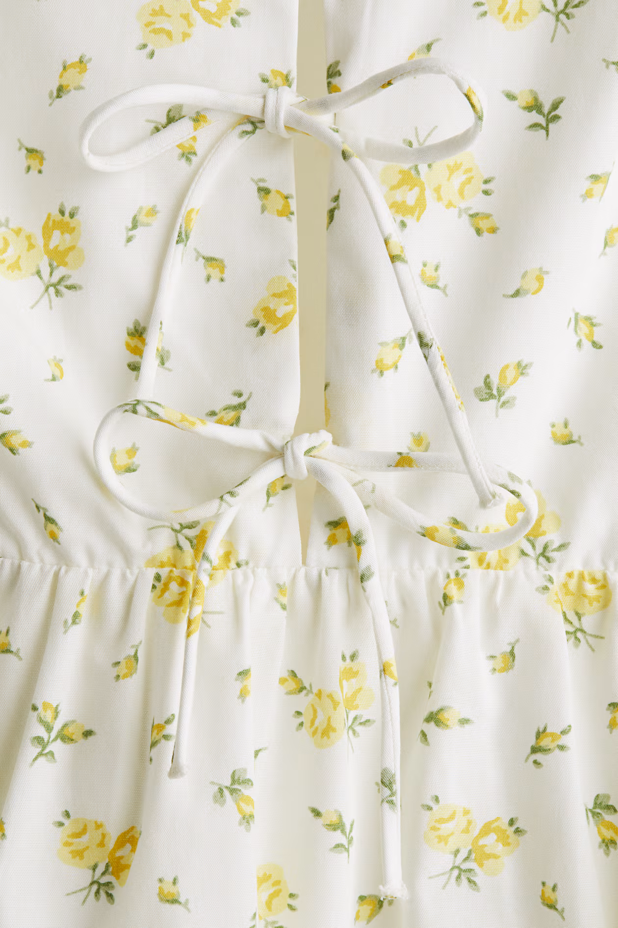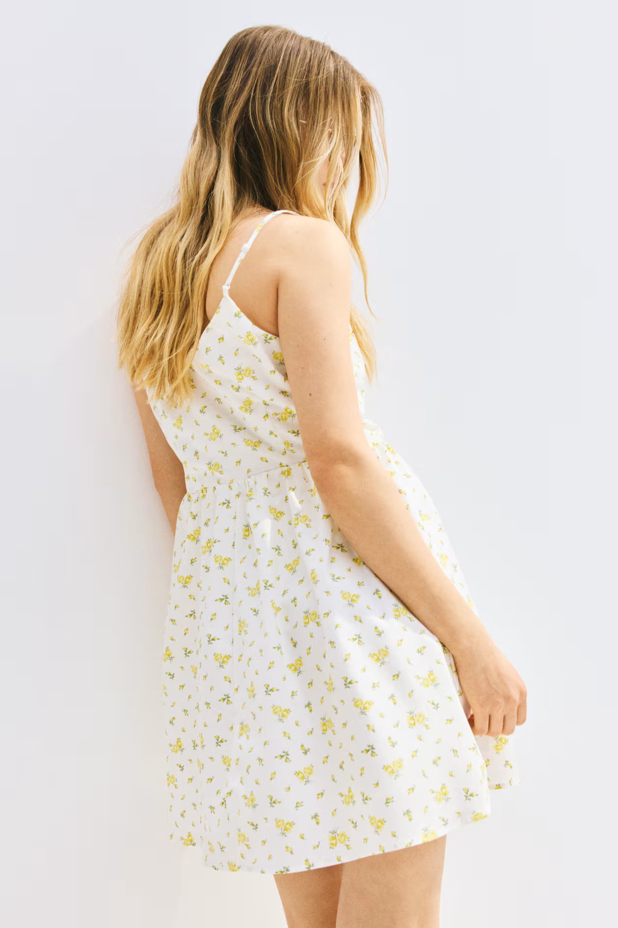 Short dress in crisp cotton poplin with a fitted bodice and flared skirt. Adjustable, extra-narrow shoulder straps, round neckline, and a slit at front with three sets of narrow ties. Concealed zipper at one side and a gathered seam at waist. Partly lined.