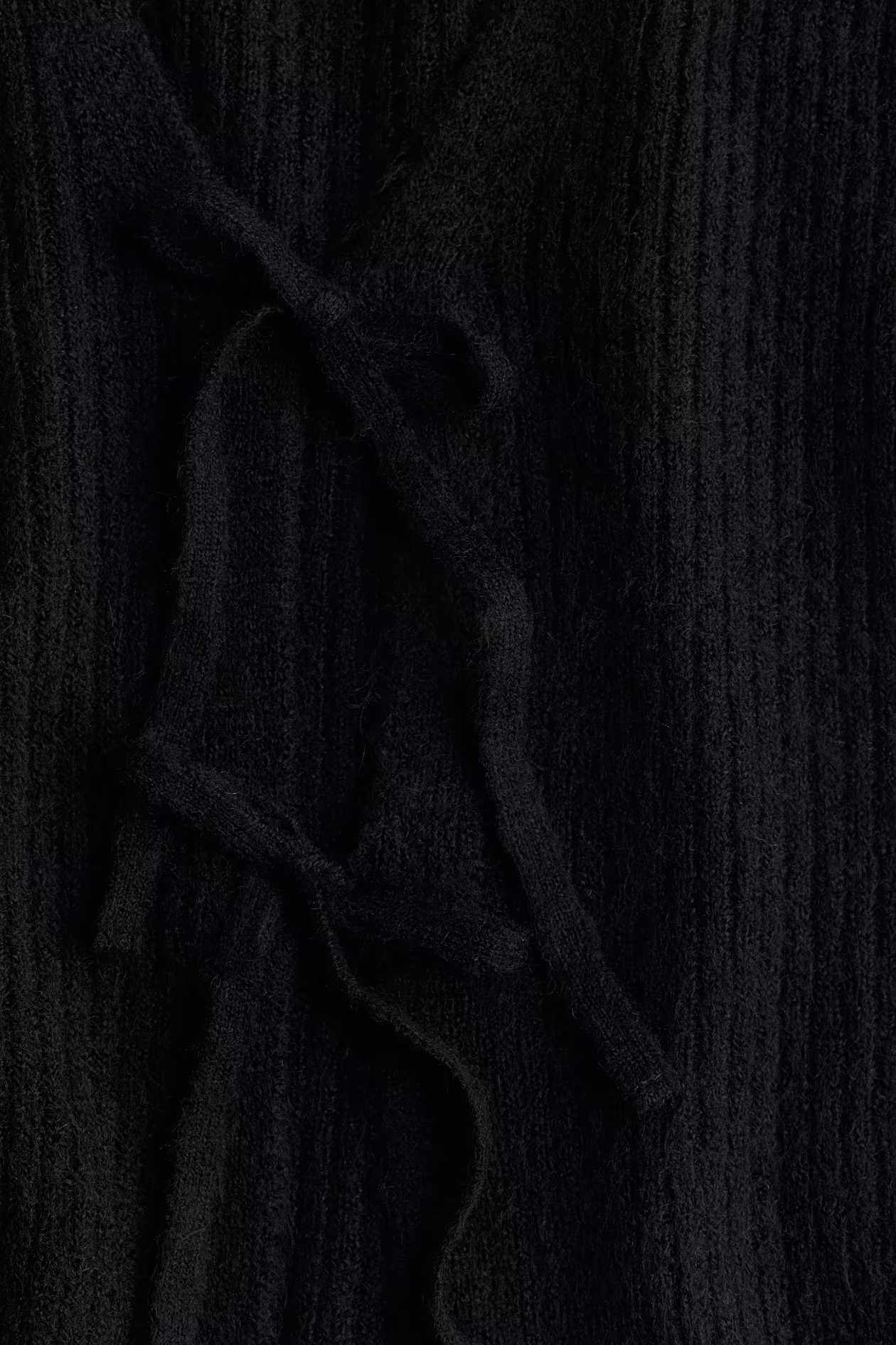 Short top in a soft rib knit. V-neck, open front with two sets of narrow ties, and short sleeves.