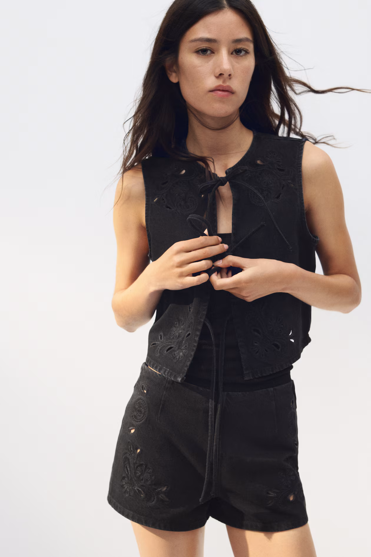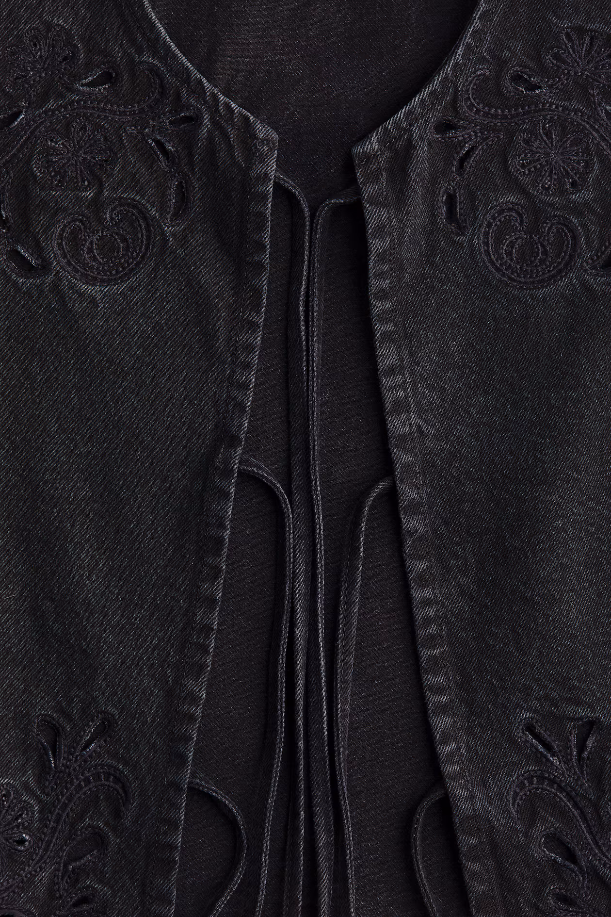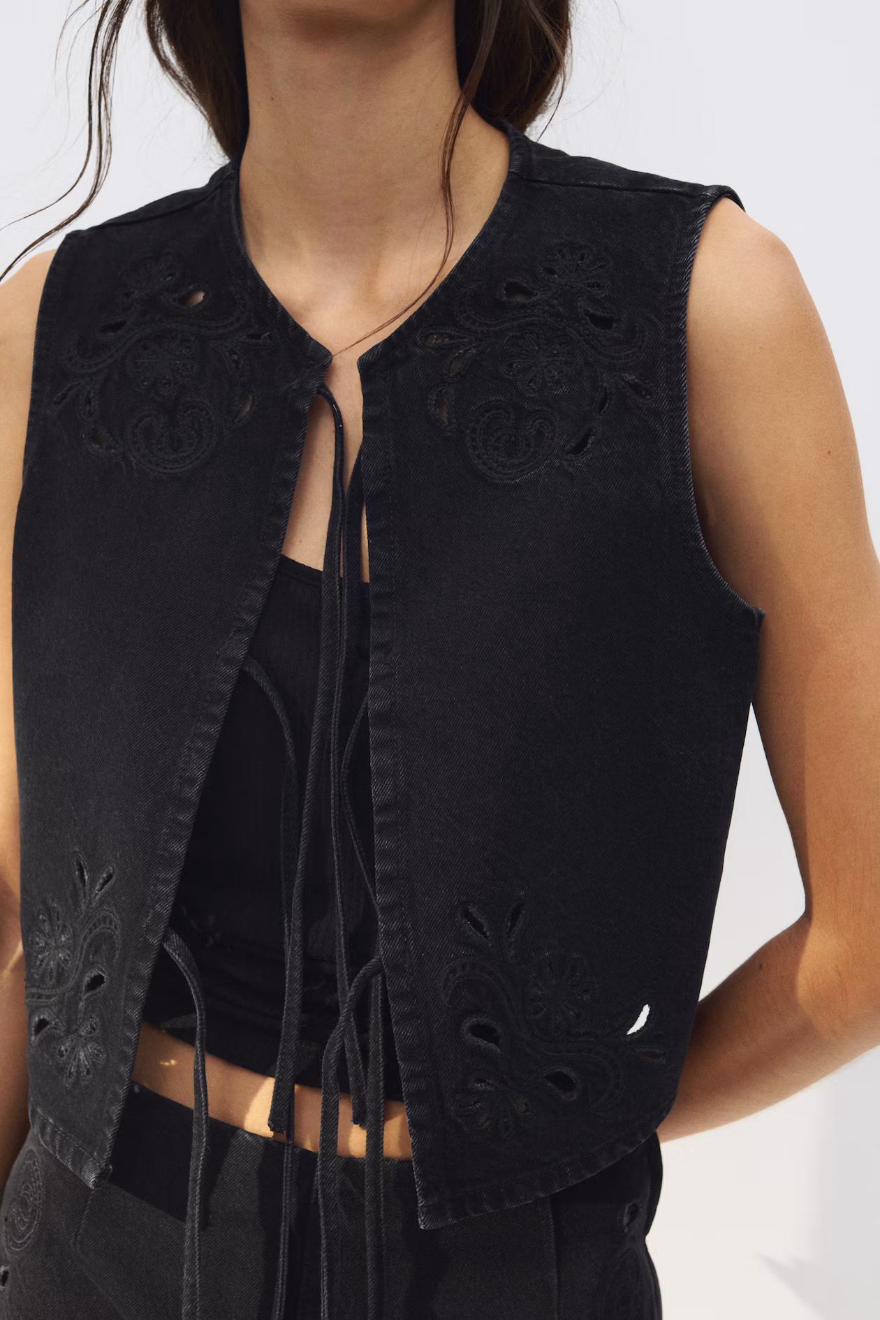 Fitted, cropped vest in rigid cotton denim with an embroidered motif and eyelet embroidery. Round neckline, three sets of narrow ties at front, and a yoke at back.