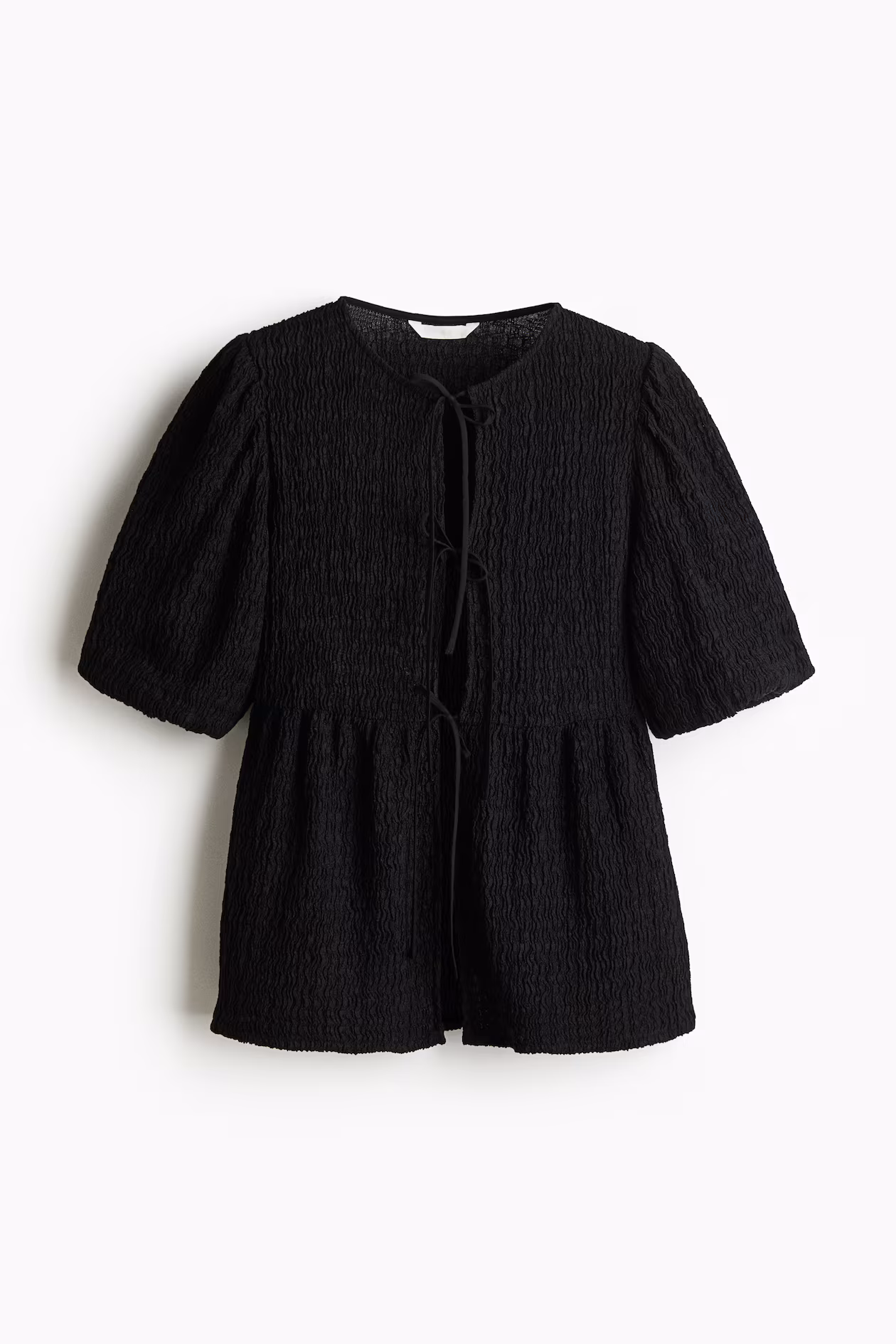 Top in textured jersey. Round neckline, open front with three pairs of narrow ties, and short, lined balloon sleeves with elasticized cuffs. Flared peplum.