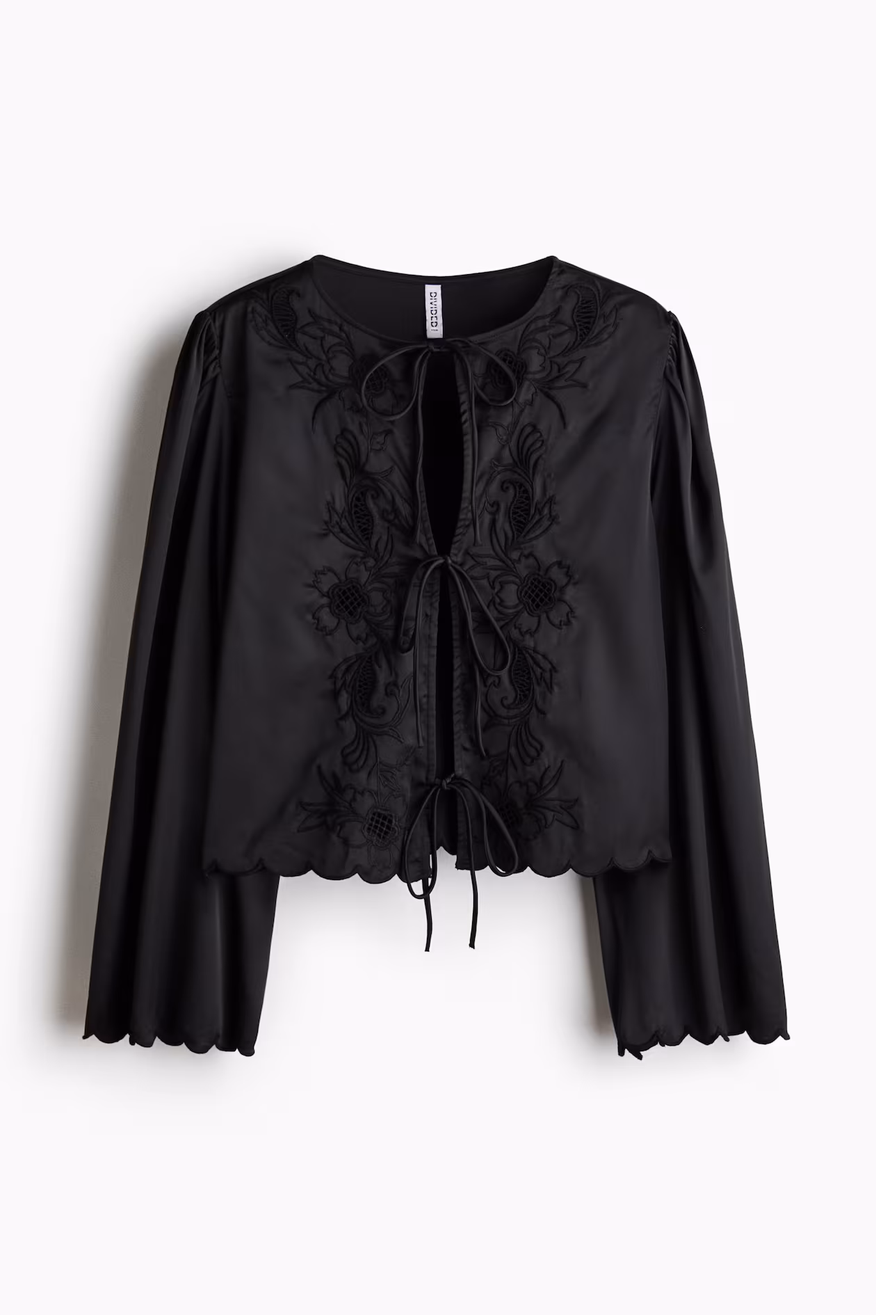 Blouse in satin with an embroidered motif at front. Round neckline and open front with three sets of narrow ties. Gathers on shoulders, long sleeves, and scalloped edges at cuffs and hem.
