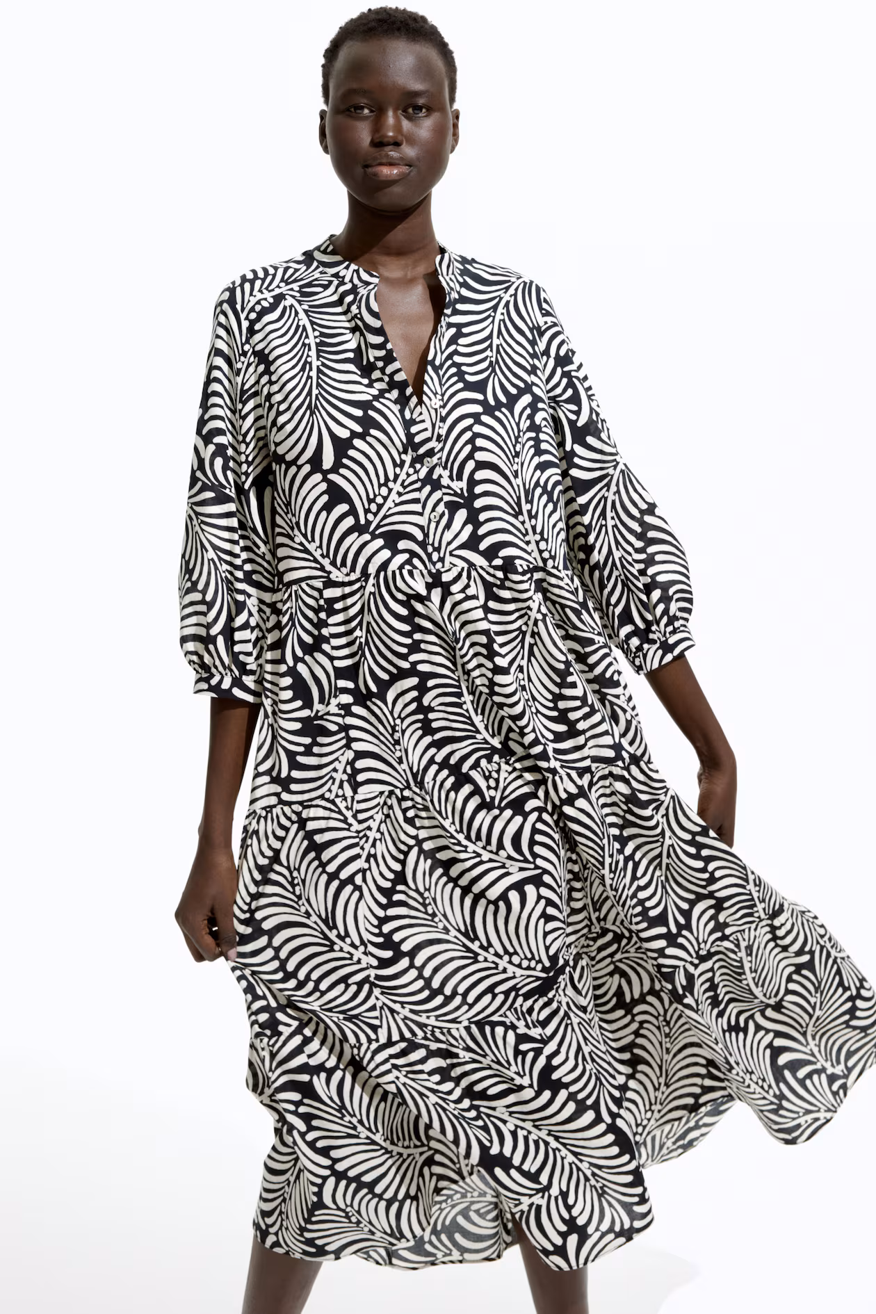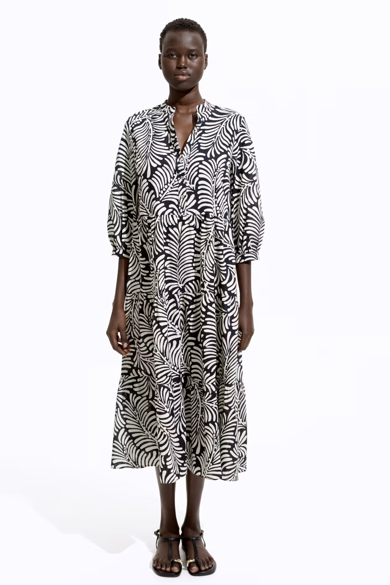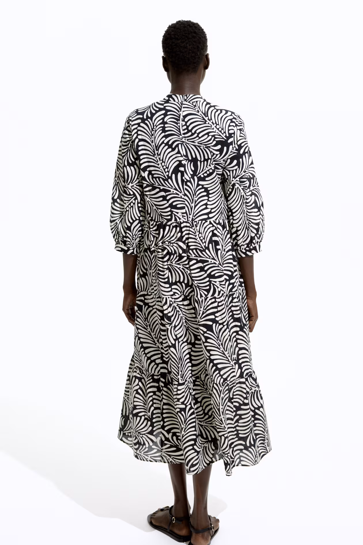 Calf-length dress in woven cotton. Band collar with a V-shaped opening at front. Buttons at front, 3/4-length balloon sleeves with narrow cuffs, and a flared skirt with gathered tiers for added volume. Unlined.