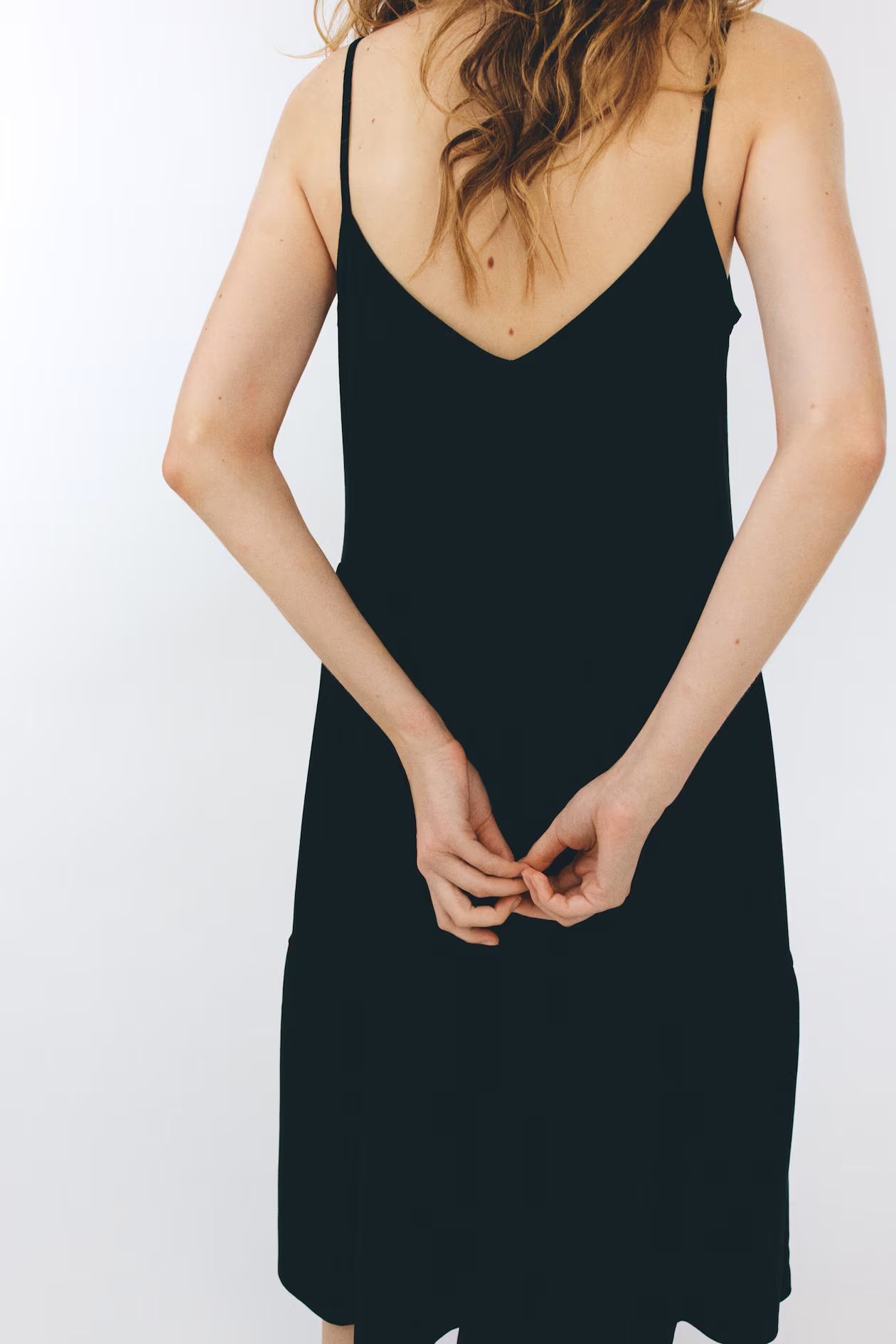 Loose-fit maxi dress in jersey. Extra-narrow shoulder straps, V-neck, and gathered tiers for added volume.