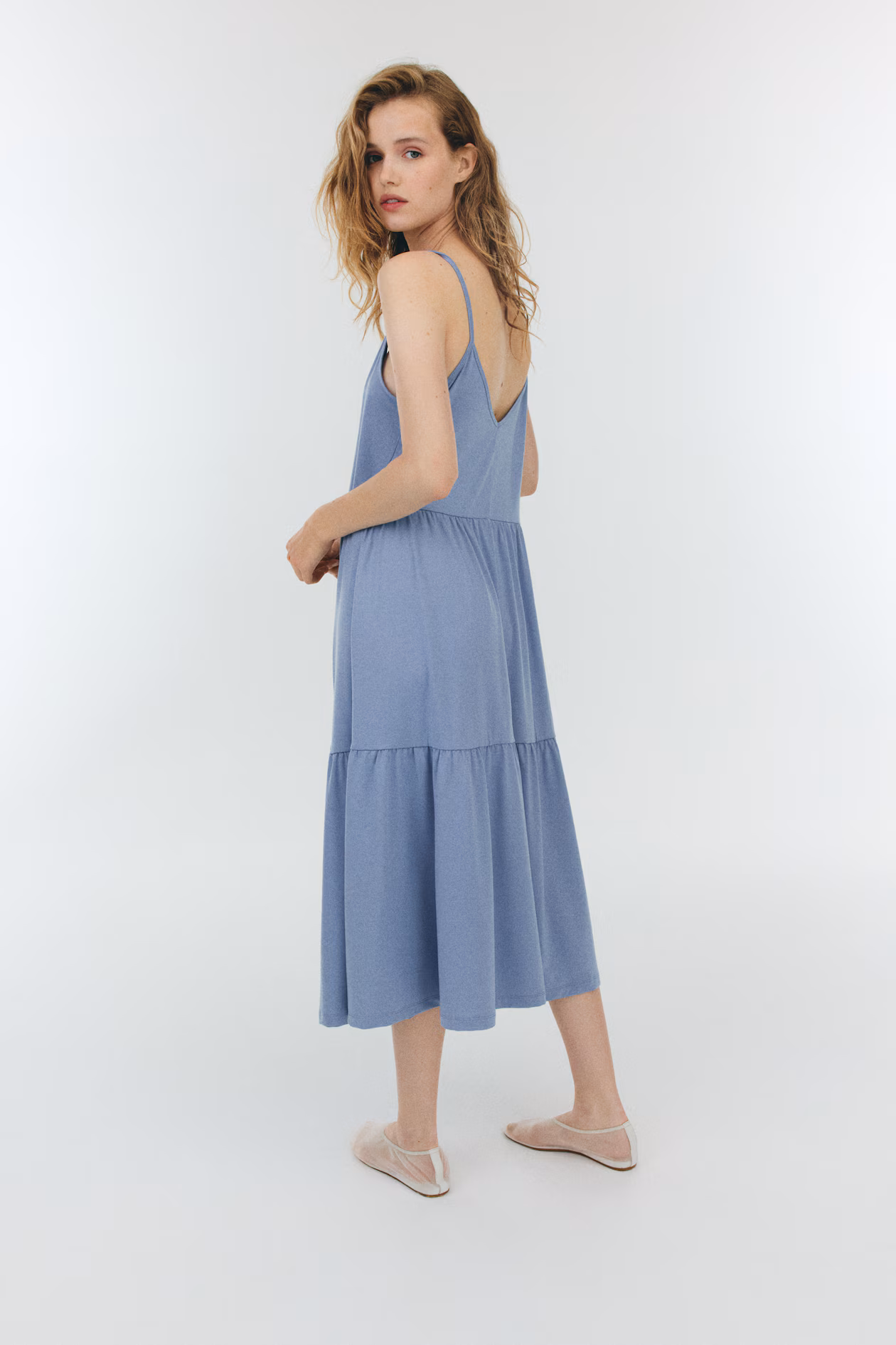 Loose-fit maxi dress in jersey. Extra-narrow shoulder straps, V-neck, and gathered tiers for added volume.