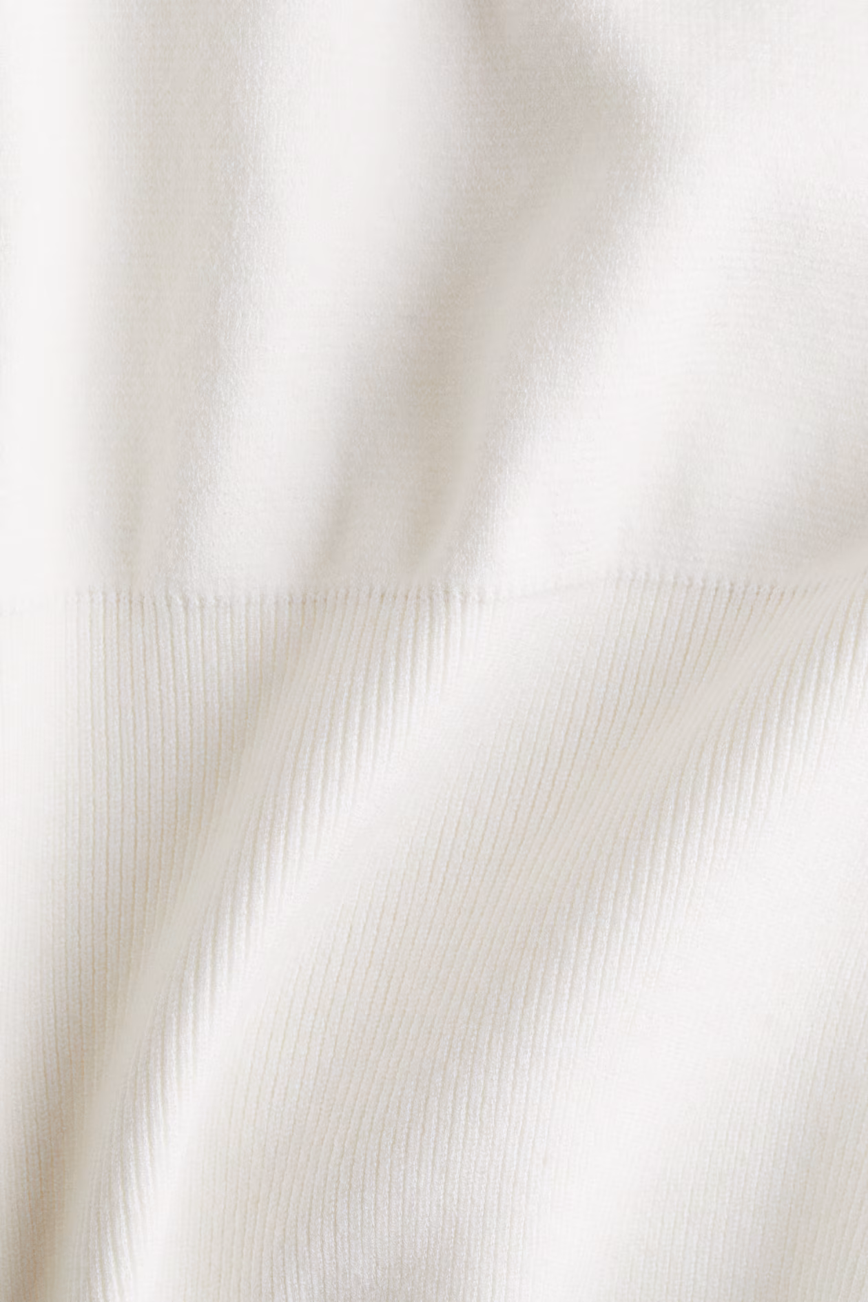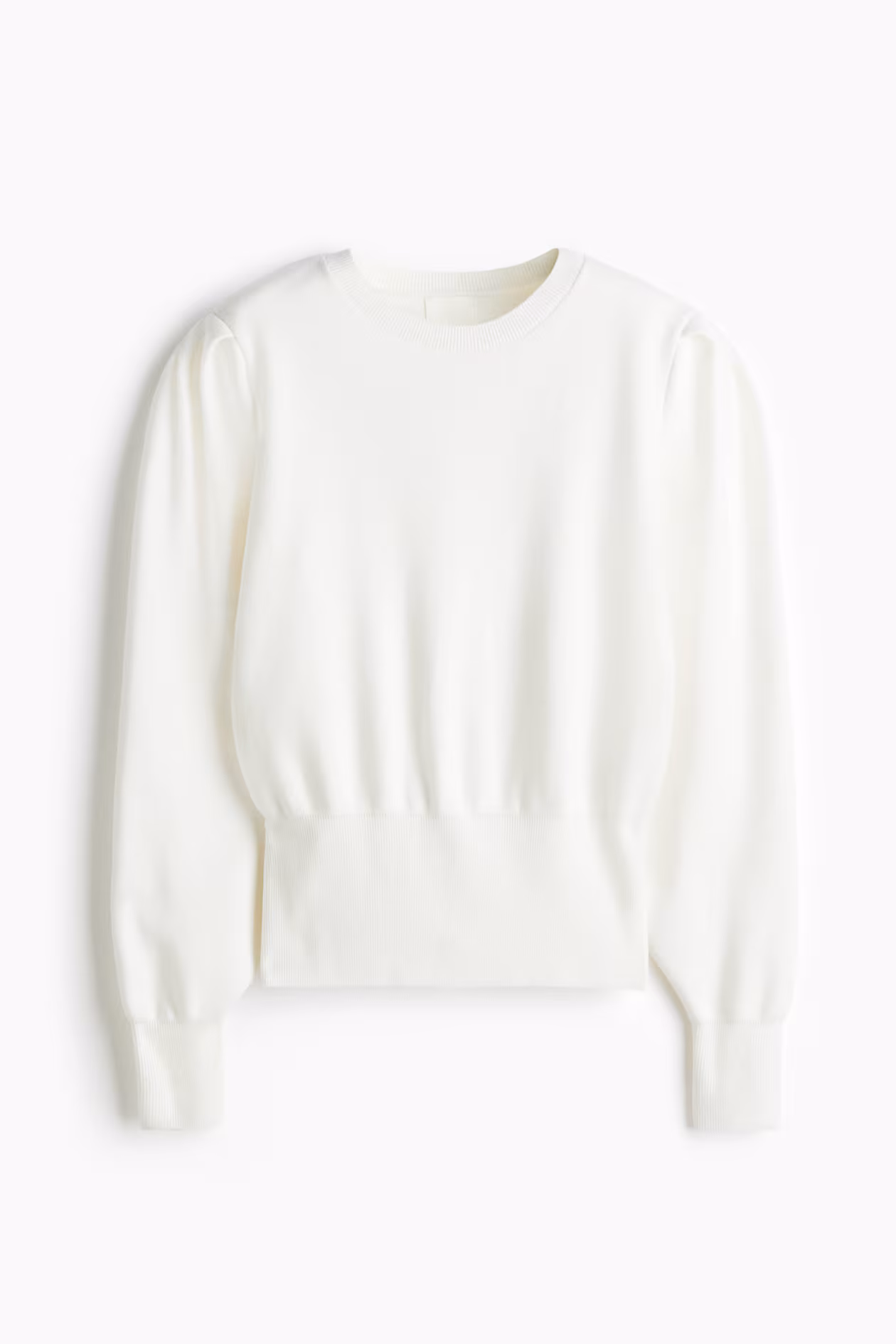 Short, fine-knit top. Crew neck, shoulder pads, and long sleeves with pleats at top and ribbed cuffs. Gathers and a wide, ribbed section at hem.