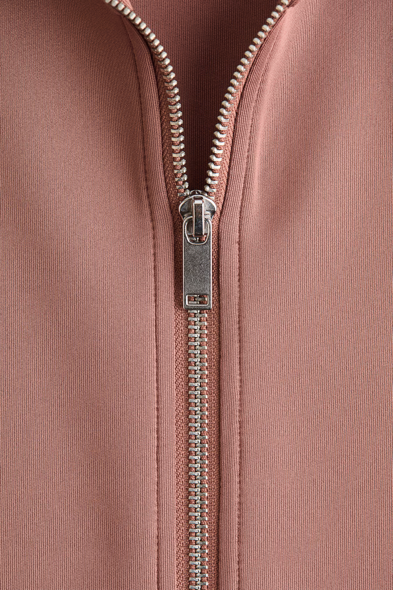 Short track jacket in thick jersey with a slight sheen. Stand-up collar, zipper at front, and welt side pockets.