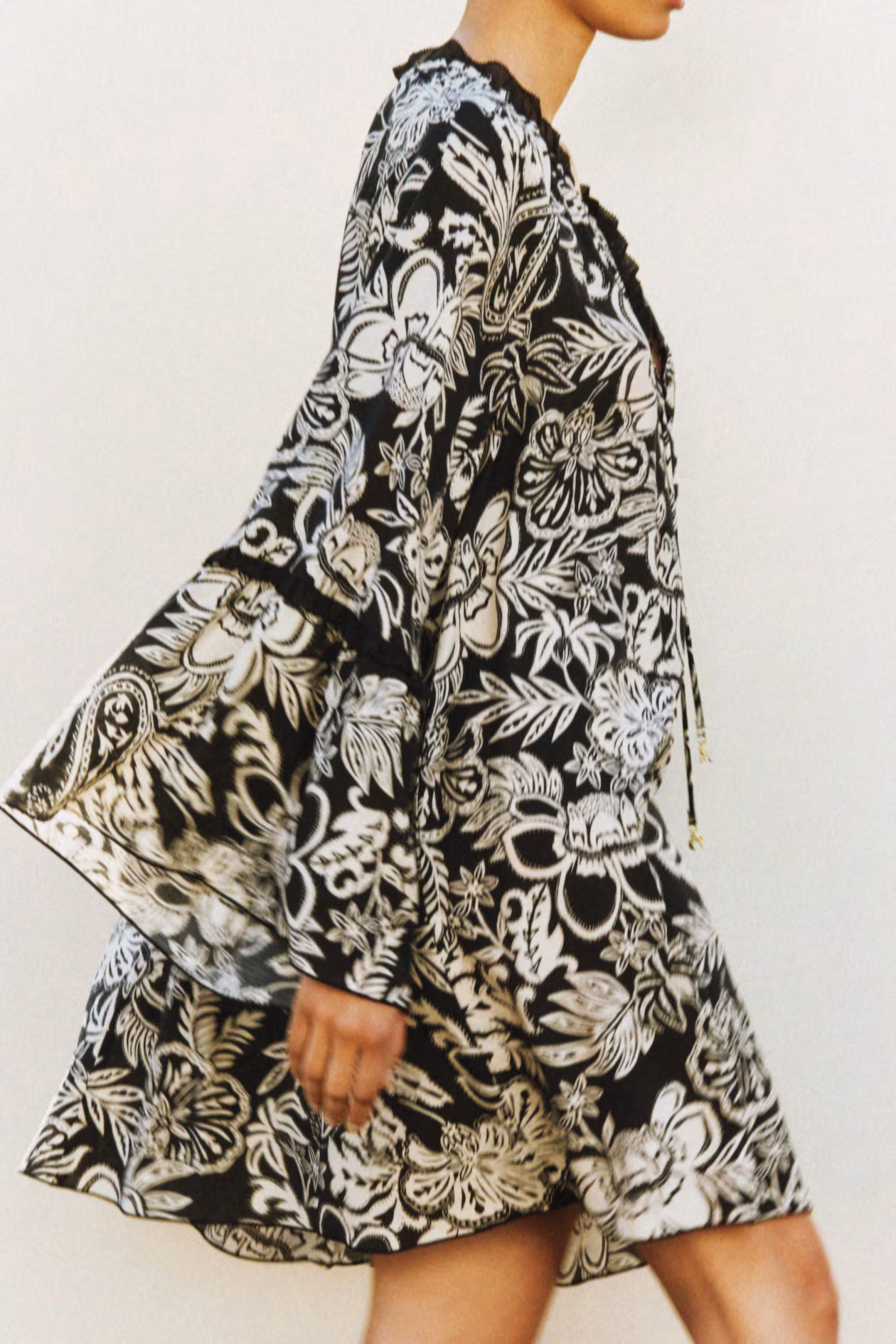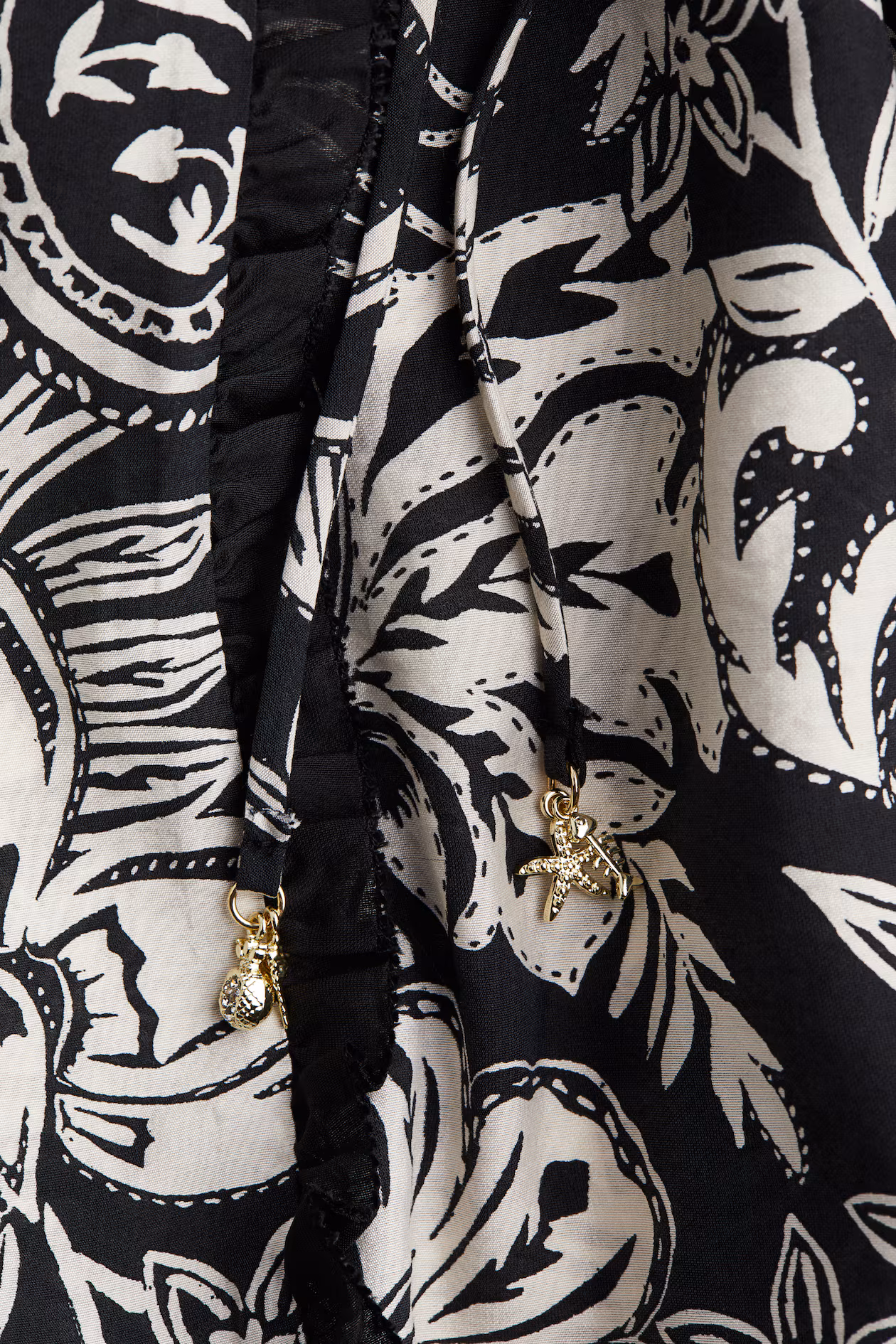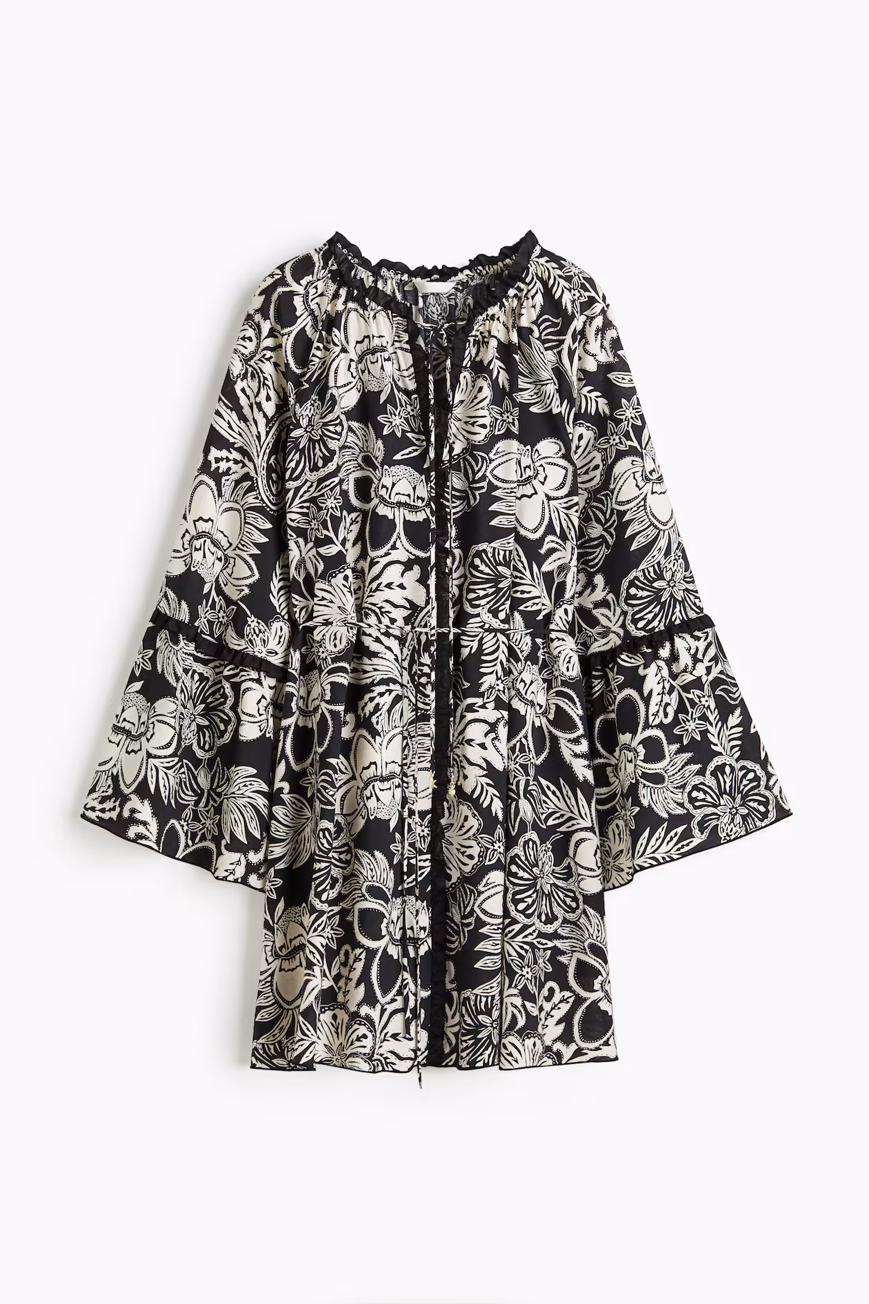 Short, loose-fit, A-line dress in airy, woven fabric with delicate eyelash-stitched edges. Ruffled neckline with an extra-narrow drawstring with gold-colored pendants, and a V-shaped opening at front. Extra-narrow removable tie belt at waist and long raglan trumpet sleeves with ruffle trim above cuffs. Unlined.