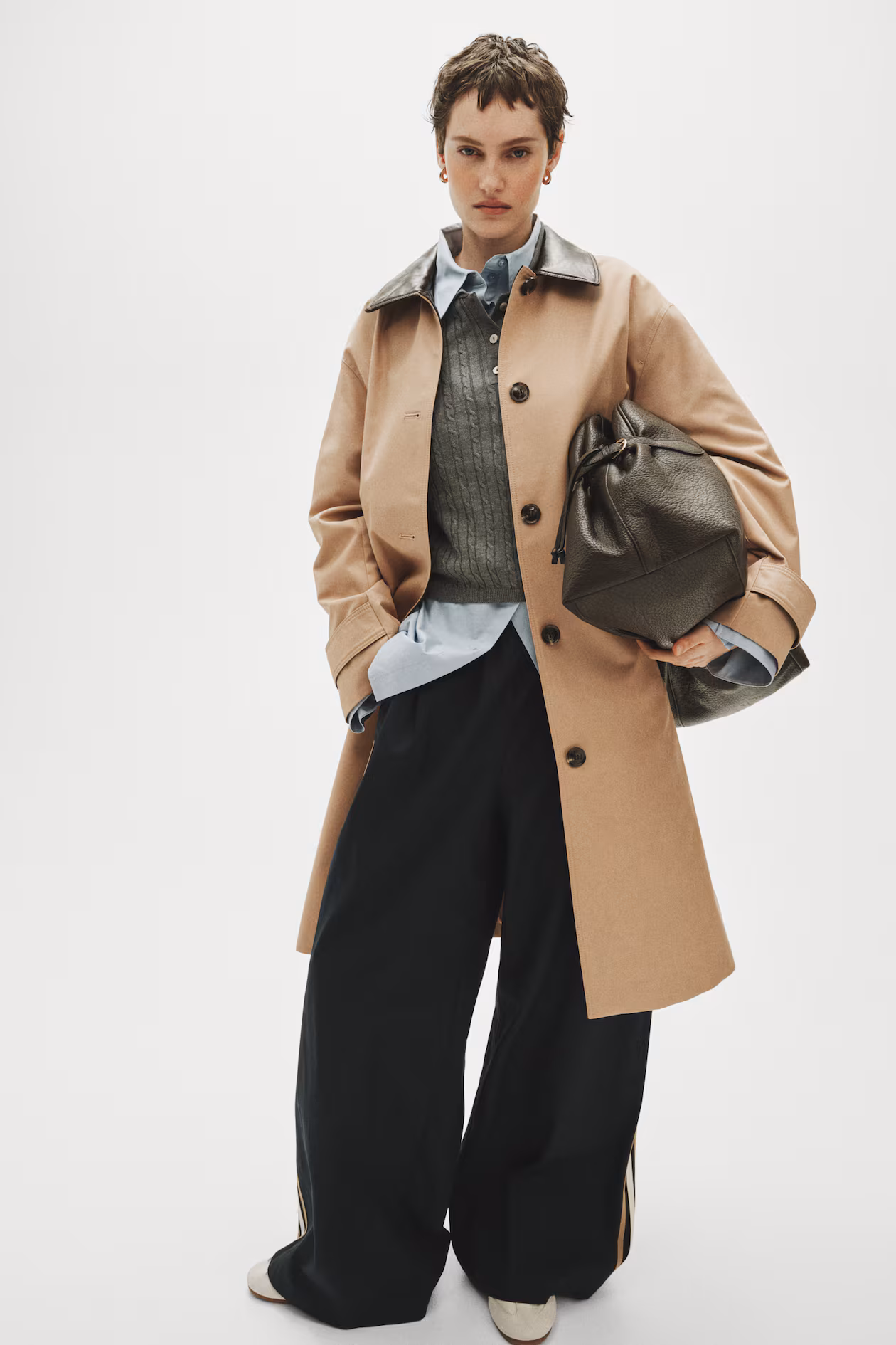 Knee-length car coat in twill with a collar in coated fabric. Buttons at front, welt side pockets, and an adjustable tab at cuffs with button. Vent at back. Lined.