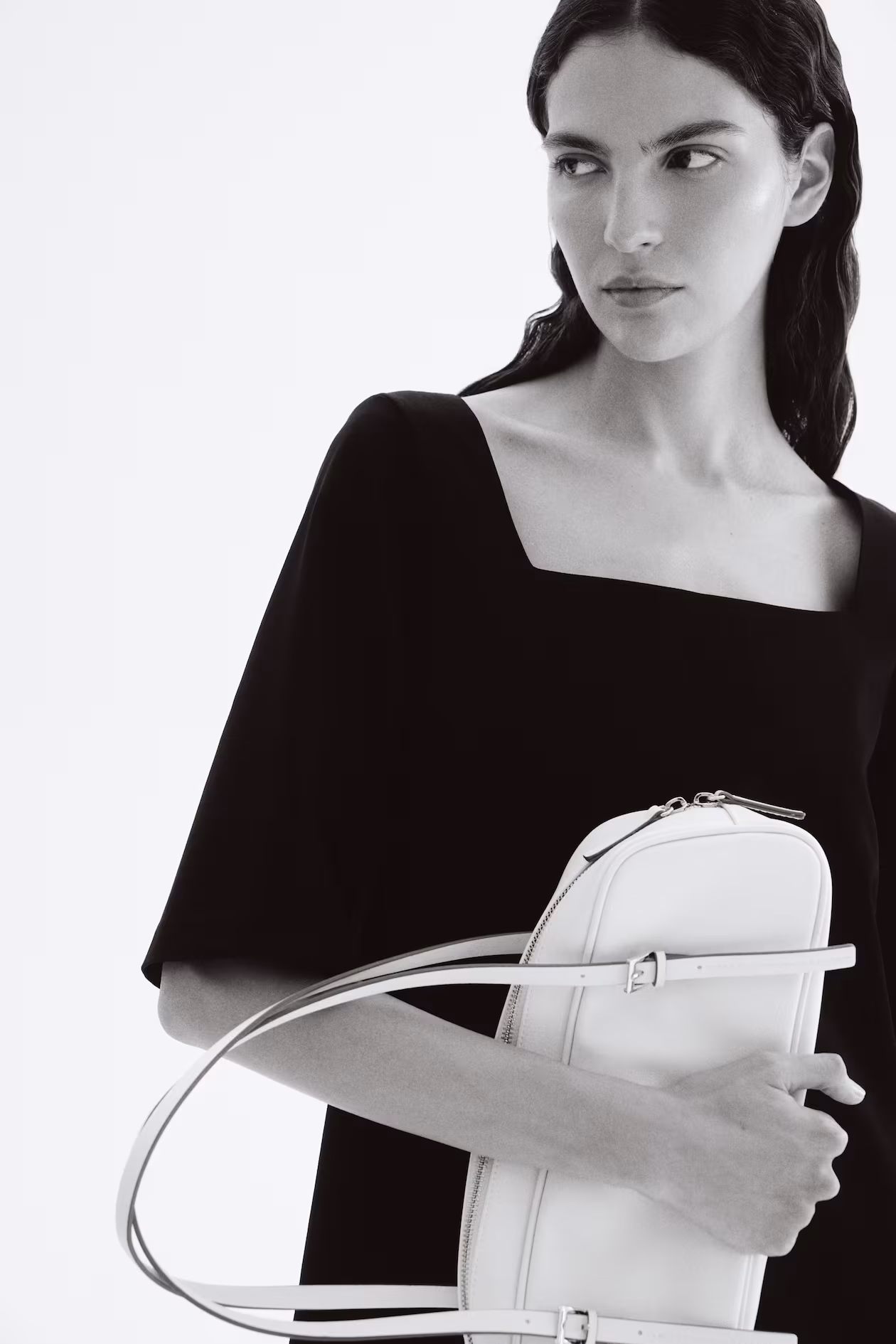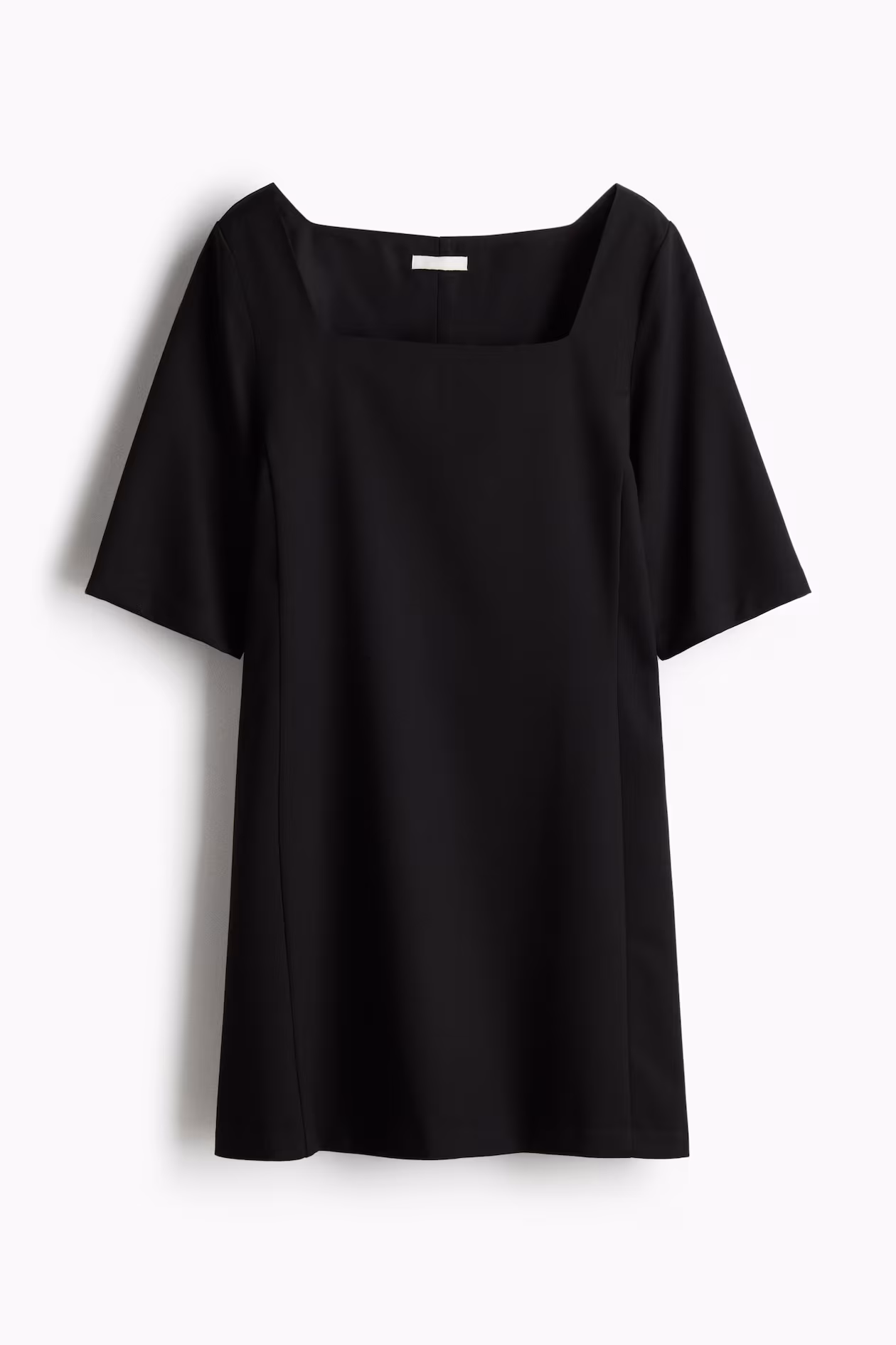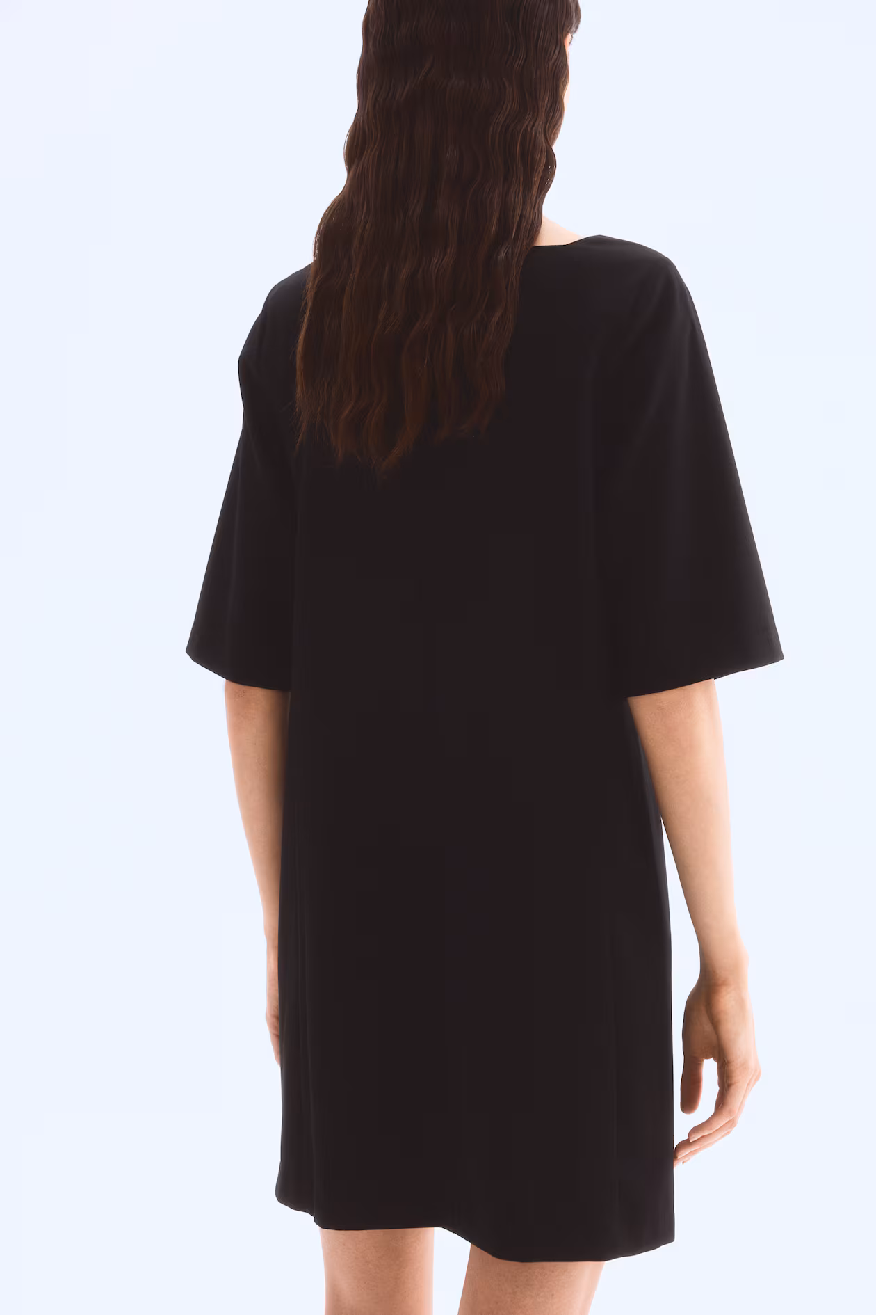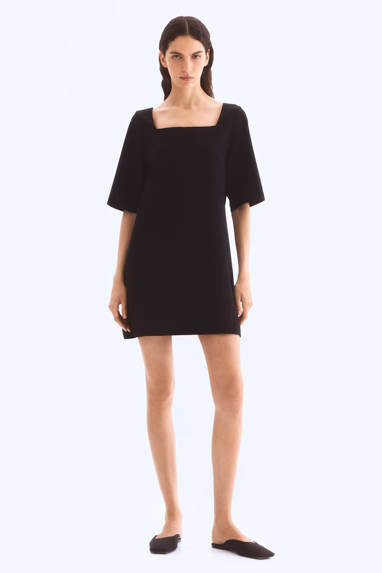 Short dress in twill with shaping seams at front and back. Square neckline and elbow-length sleeves. Unlined.