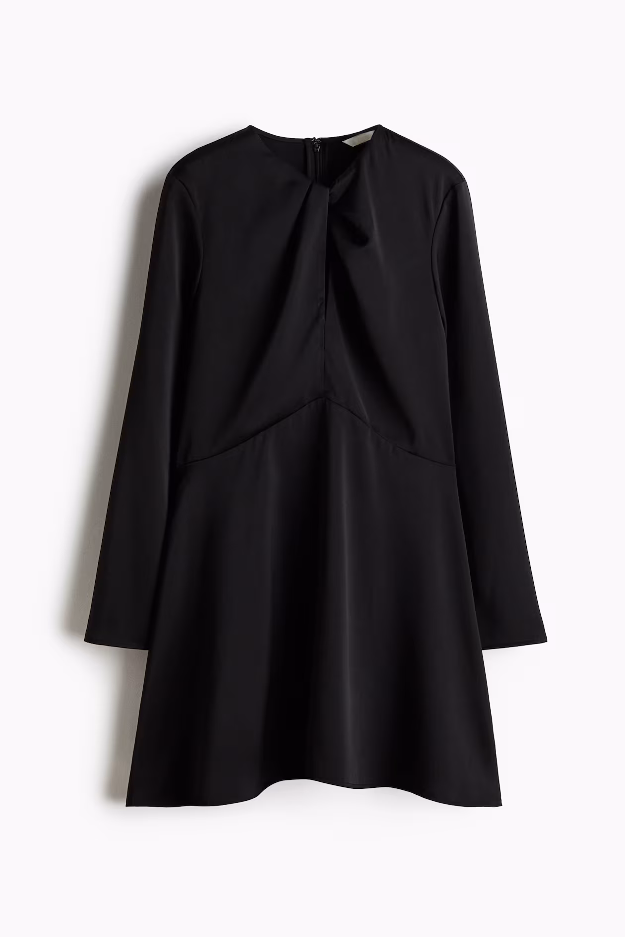 Short dress in woven fabric. Round neckline, slit at front with a twisted detail, concealed zipper at back with hook-and-eye fastener, and long sleeves with a slit at cuffs. Gently flared skirt. Unlined.