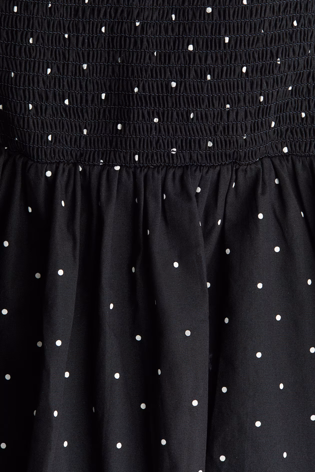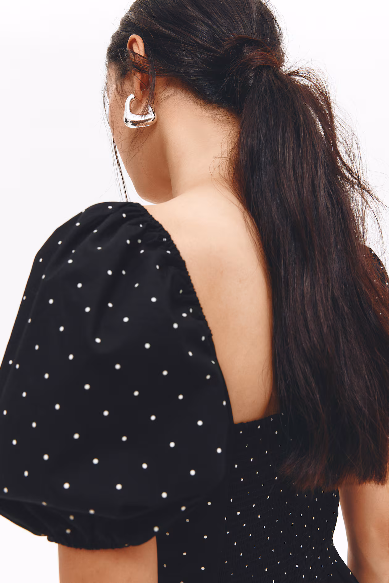 Short, fitted dress in cotton poplin. Low-cut V-neck at front with a twisted detail, cutout section at center bust, and low-cut back with wide smocking. Concealed zipper at one side, elbow-length puff sleeves, and narrow elastic at cuffs. Partly lined.